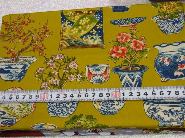 100*47★黄土色・焼き物・和柄の・ハギレ・生地・布★0552-76