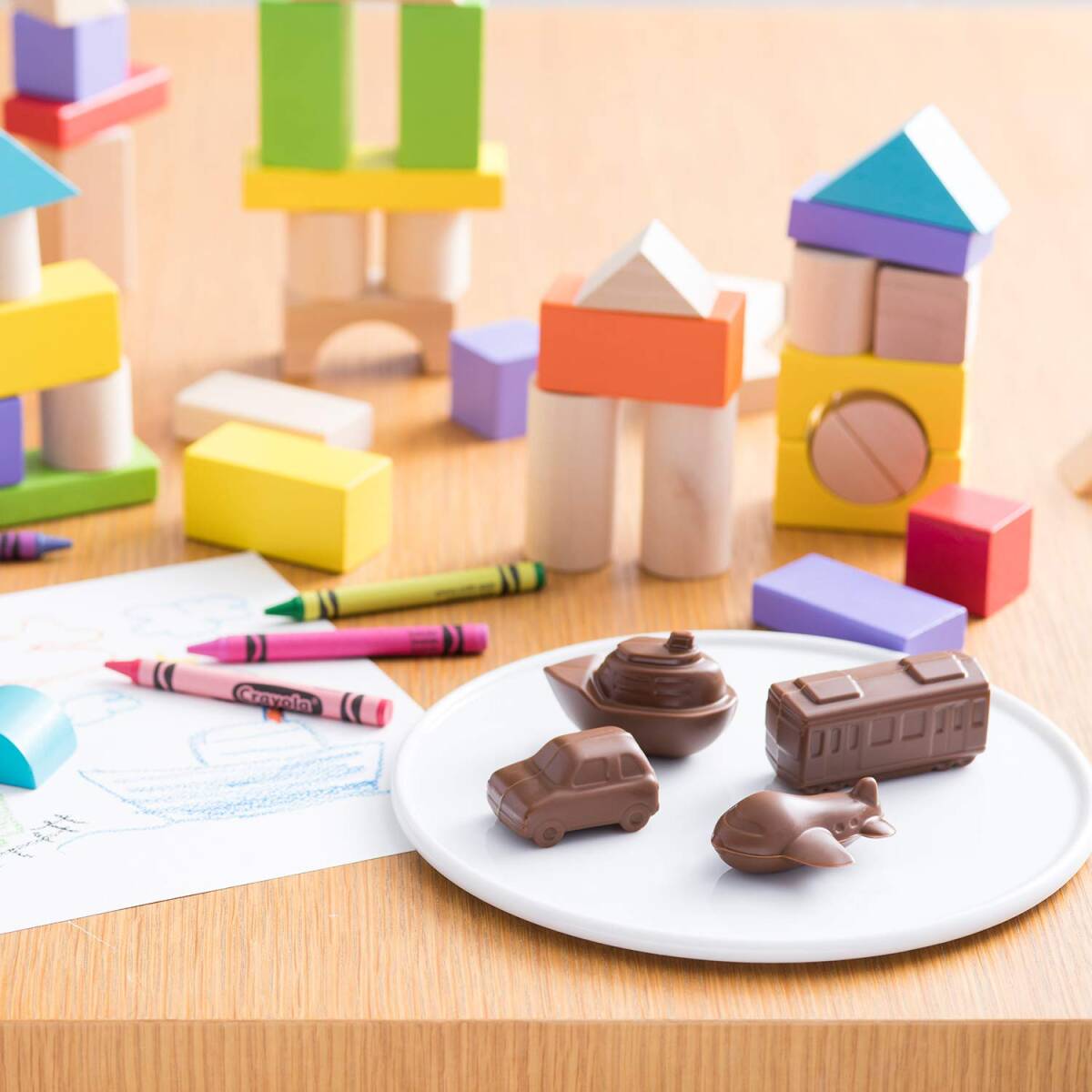●お子様でもお手伝いが楽しくなるリトルシェフクラブシリーズ ●半分の面にチョコを流し入れ、両面を合わせて振ることで自立する立体のチョコレートが作れます ●電車、飛行機、船、車の組み合わせです