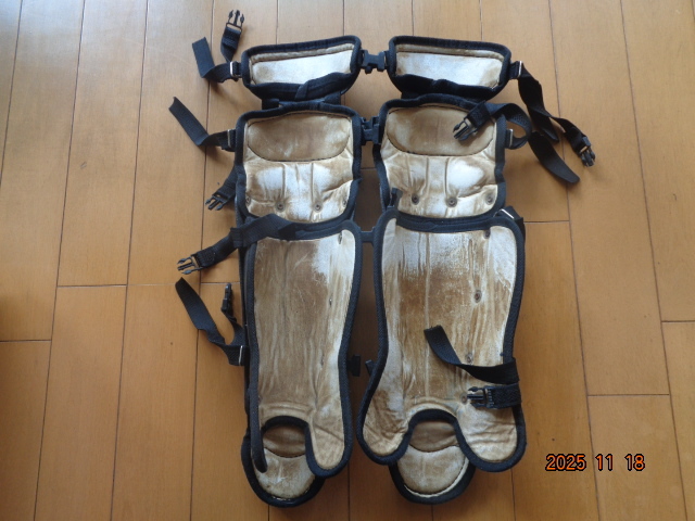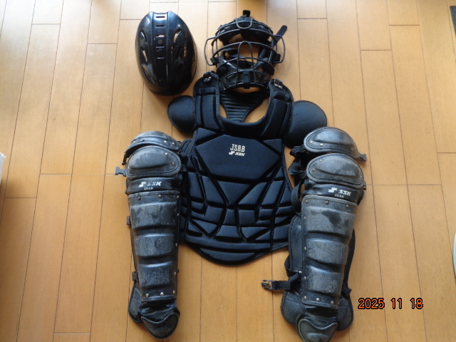 一般軟式野球用防具4点セットです、ヘルメット、マスク、プロテクター、レガースが含まれています。