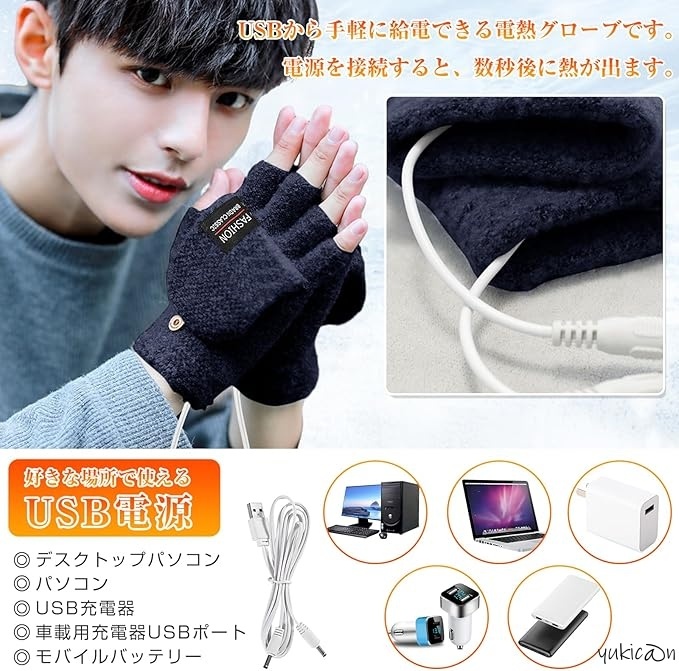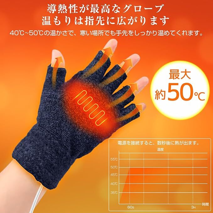 指先まで温まりやすいUSB給電式の電熱グローブです。