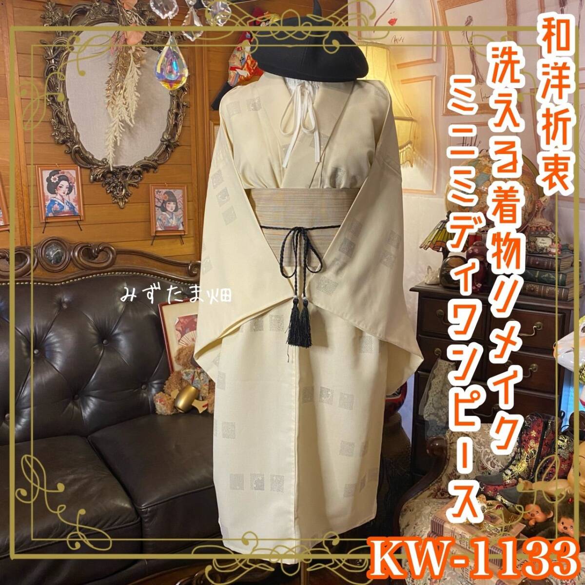 【単衣着物 リメイク ミニミディワンピース ドレス 洗える 化繊 帯サッシュベルト 和洋折衷 レトロ 古着 ハンドメイド 淡いグレーのモダン KW-1133】