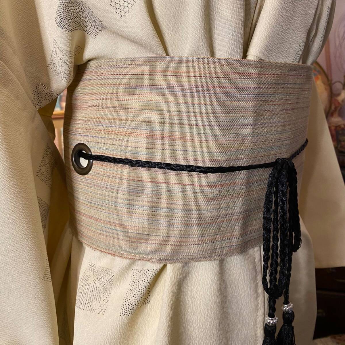 帯サッシュベルトには細やかな縞模様の織地を合わせ、黒のタッセル紐でぐっと引き締めたシックなアクセントを添えました。