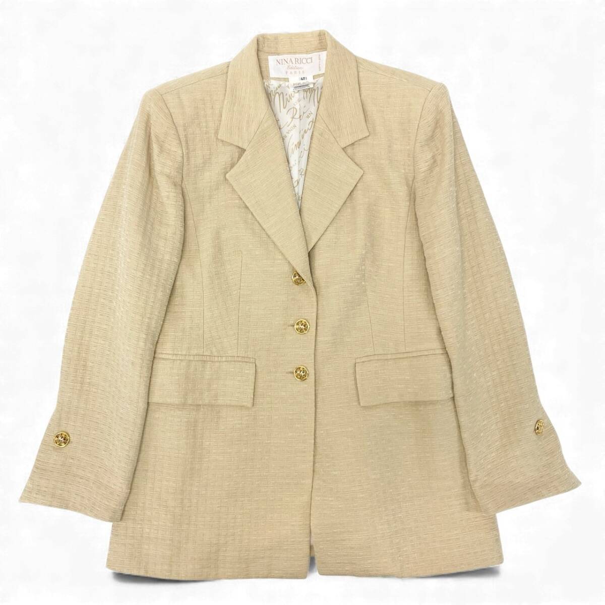 | スタッフ商品コメント | 上品なライトベージュ(サンドベージュ)のジャケットで、柔らかな表情のマットなウール混生地風のテクスチャーが特徴です。フロントにはクラシックなゴールド調ボタンがあしらわれ、Nina Ricciらしい洗練されたエレガンスを感じられる一着です。ヒップが隠れるロングジャケット丈で、体のラインをすっきり見せながらも、きちんと感のあるシルエットを演出します。通勤のジャケットスタイルから、ワンピースの羽織りとしてのフォーマルシーンまで幅広く活躍します。 |