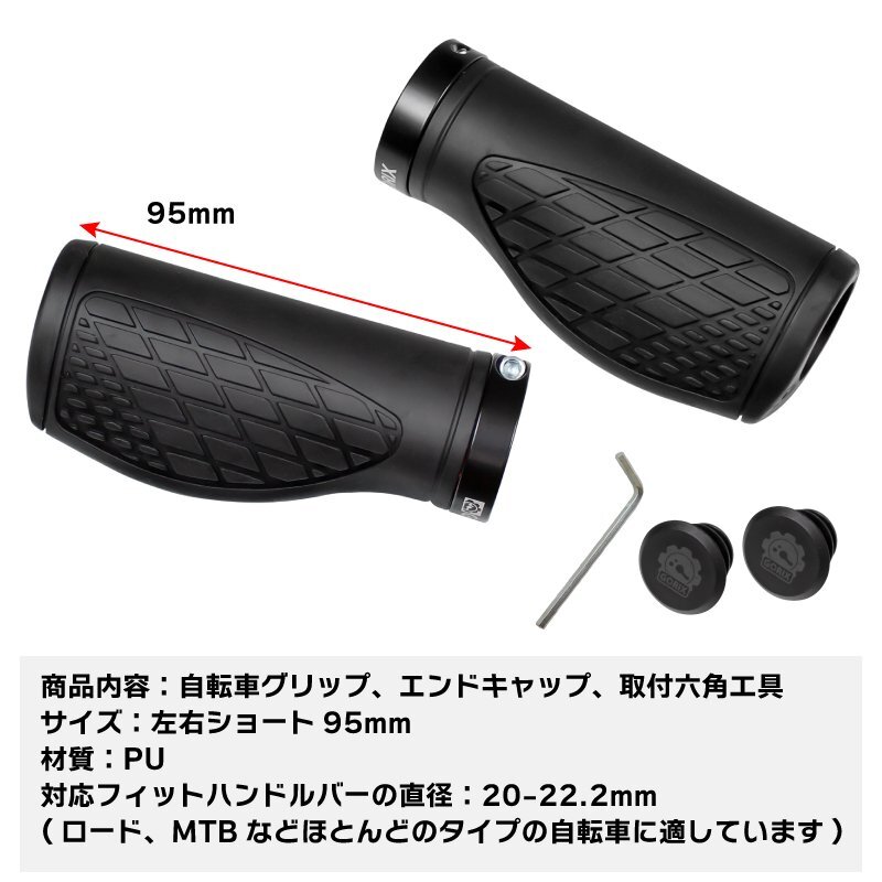 短めの自転車ショートグリップをお探しの方へ。 エルゴデザインで握りやすく疲れにくいグリップ。 手首の疲れや、腱鞘炎で悩んでいる方におすすめです。 掌の広さから親指まで心地よく握られ、体の重みが手の平にうまく分散し、痛みと疲れを大幅低減。 前傾姿勢も楽にキープできます。 クロスバイクやマウンテンバイク・ミニベロ・電動自転車などフラットハンドルの自転車に最適。 取付け工具付属ですぐに装着作業ができます。 [エルゴデザイン] 手のひらをベタっと乗せて力を分散しとても楽に! 長時間の乗車も快適に。 [衝撃吸収] 程よい柔らかさで路面からの衝撃を吸収し体への負担を軽減。 グリップ表面に滑り止め加工を施しグリップ力を向上させます。 [装着しやすい] 内側の芯がグリップ装着時に通常のゴムタイプより滑りやすく 着脱作業がしやすい。 [しっかり固定] ネジで固定のロックオンタイプ。 ズレたりしないでしっかりと固定します。 [汚れや傷みに強い] 耐久性が高く、高強度で耐摩耗性に優れています。 商品内容グリップ、取付け工具、エンドキャップ 長さ左右ショート95mm 材質PU フィットハンドルバーの直径20-22.2mm (ロード、MTBなどなどほとんどのタイプの自転車に適しています) カラーブラウン 《ご注意》 ・きつく締め過ぎないことをお勧めします。 ・商品は入荷によりキズがある場合があります。 その場合は保証対象外になりますのでご了承お願い致します。 ・ディスプレイ環境により実物と色が異なる場合が有ります。 ・入荷時期により予告無く一部仕様変更する場合が有ります。 ・本製品は単純構造につき日本語説明書が付属しません。 | |