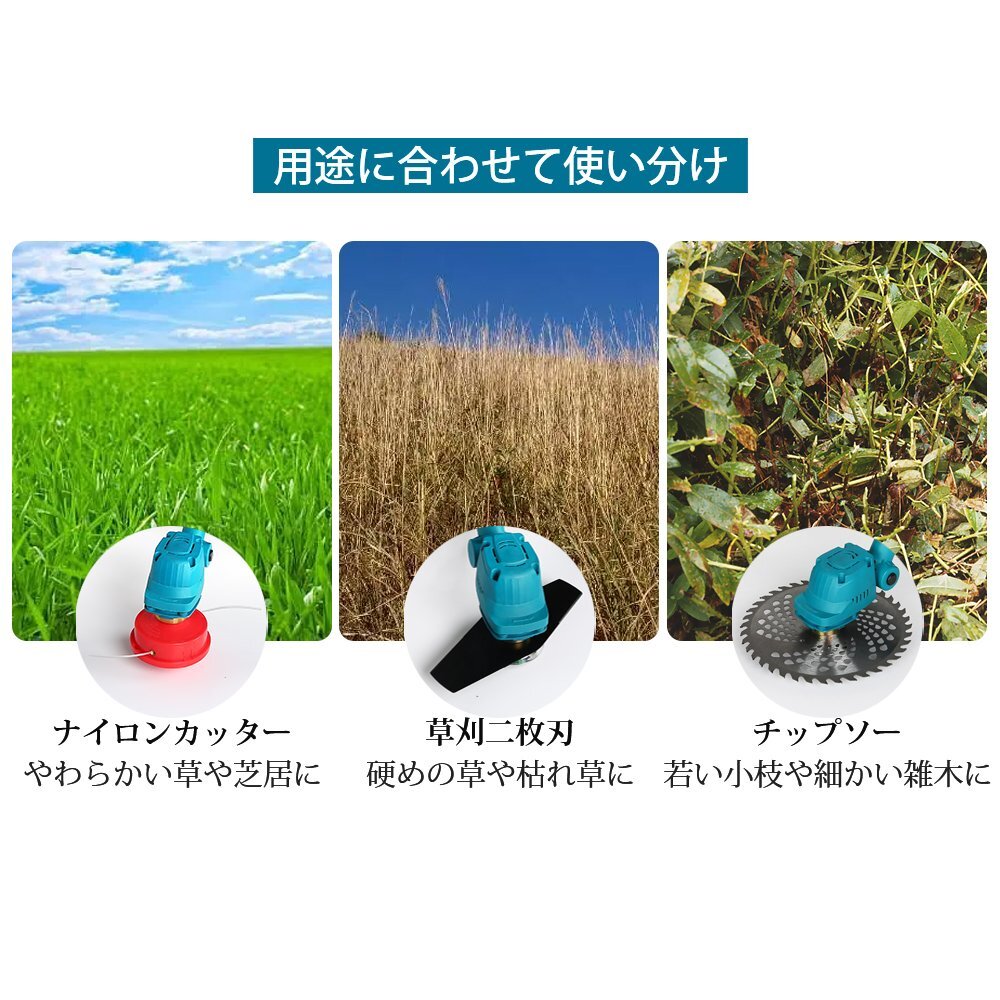 内容:コードレス草刈り ナイロンカッター×1、金属刃×1、チップソー×1(230mmもしくは255mm)、L型ソケット×1、