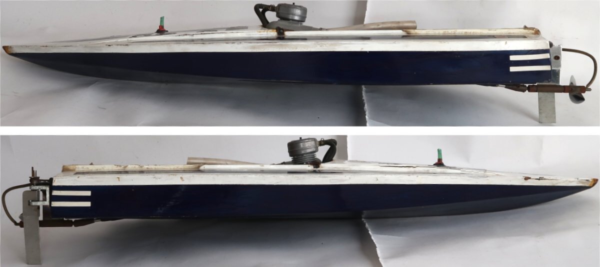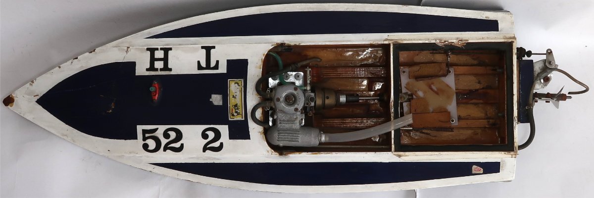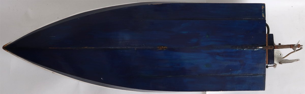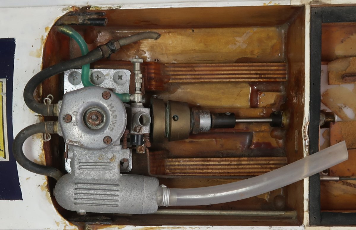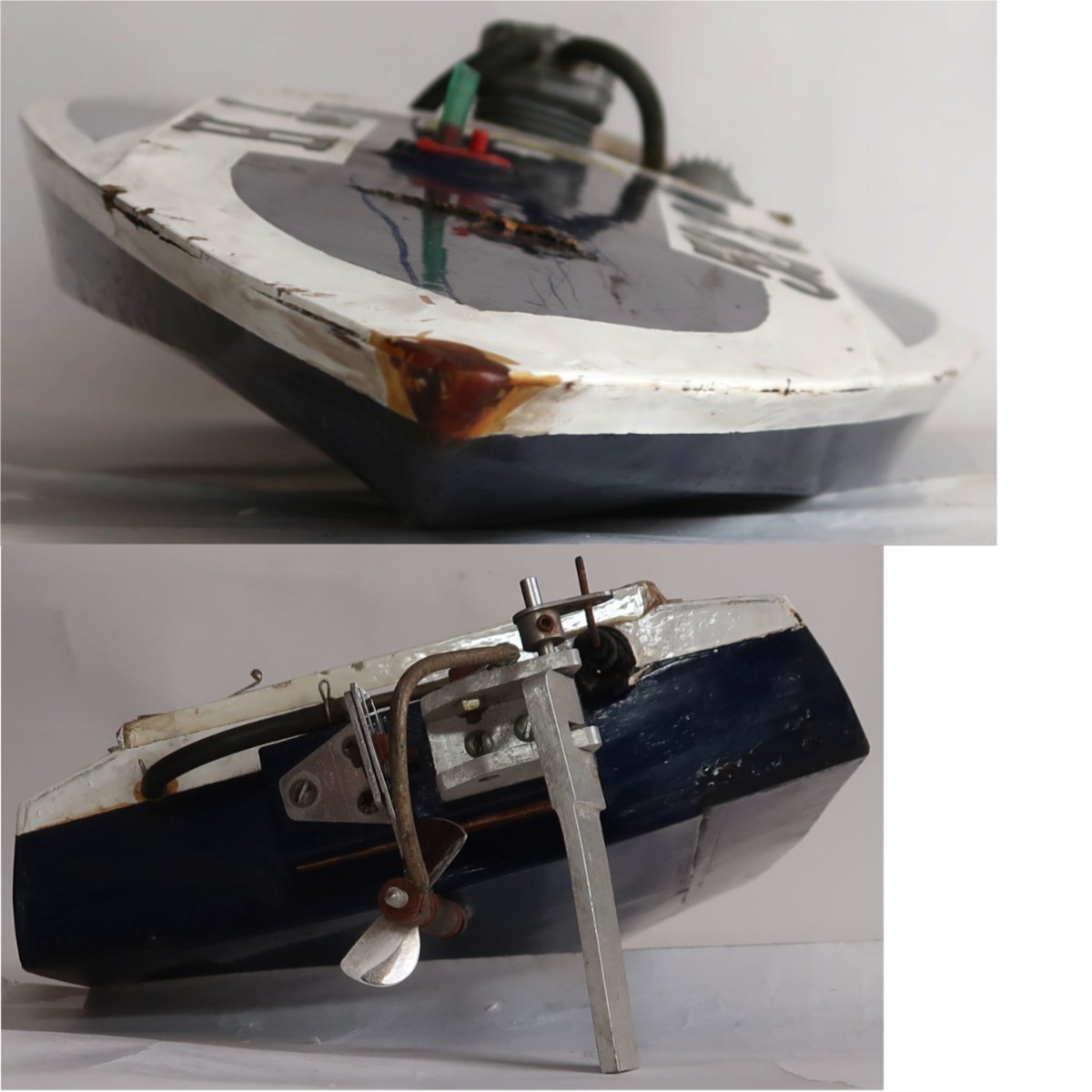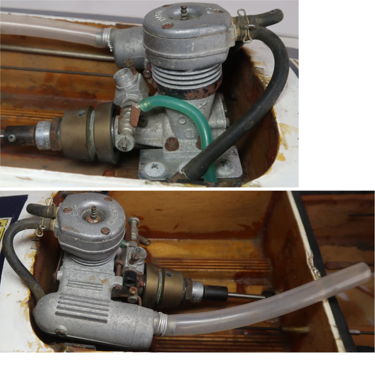 出品は画像の物のみです。使用品ですので擦れや汚れがあります。上部などに破損箇所あります。40~50年前くらい前のものなので、かなり古いです。エンジンはOS MAX 20 MARINEが付属します。画像をご覧のように上部の蓋がないです。一切の動作確認はとれておりません。分かることは以上です。お取引後のサポートはしておりません。このような状態ですのでお取引後いかなる理由がありましても返品はできませんし、クレームはお受けできません。
