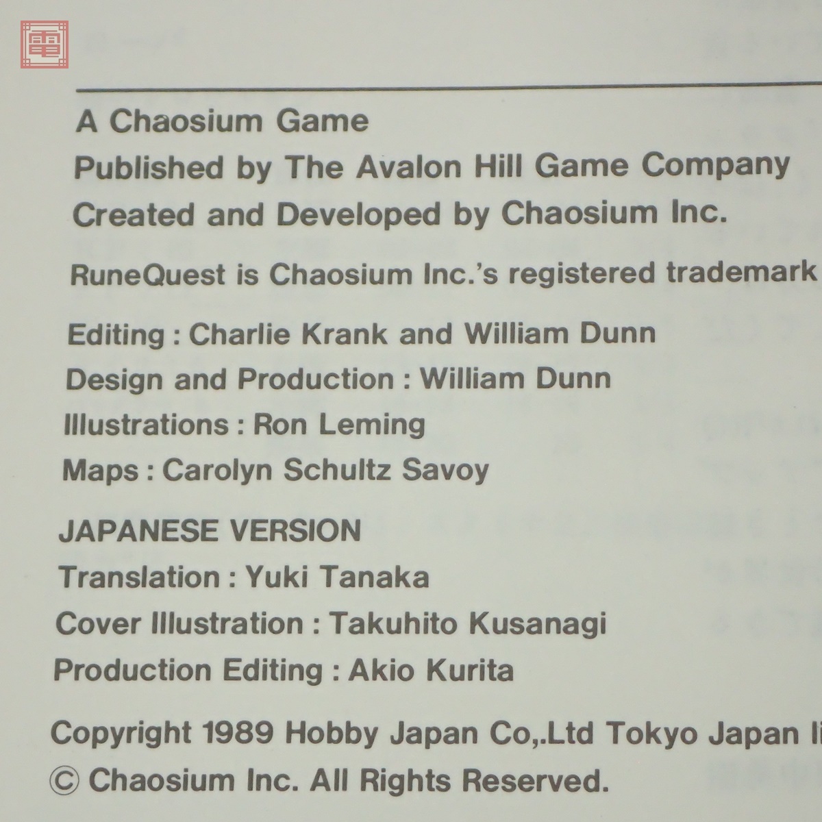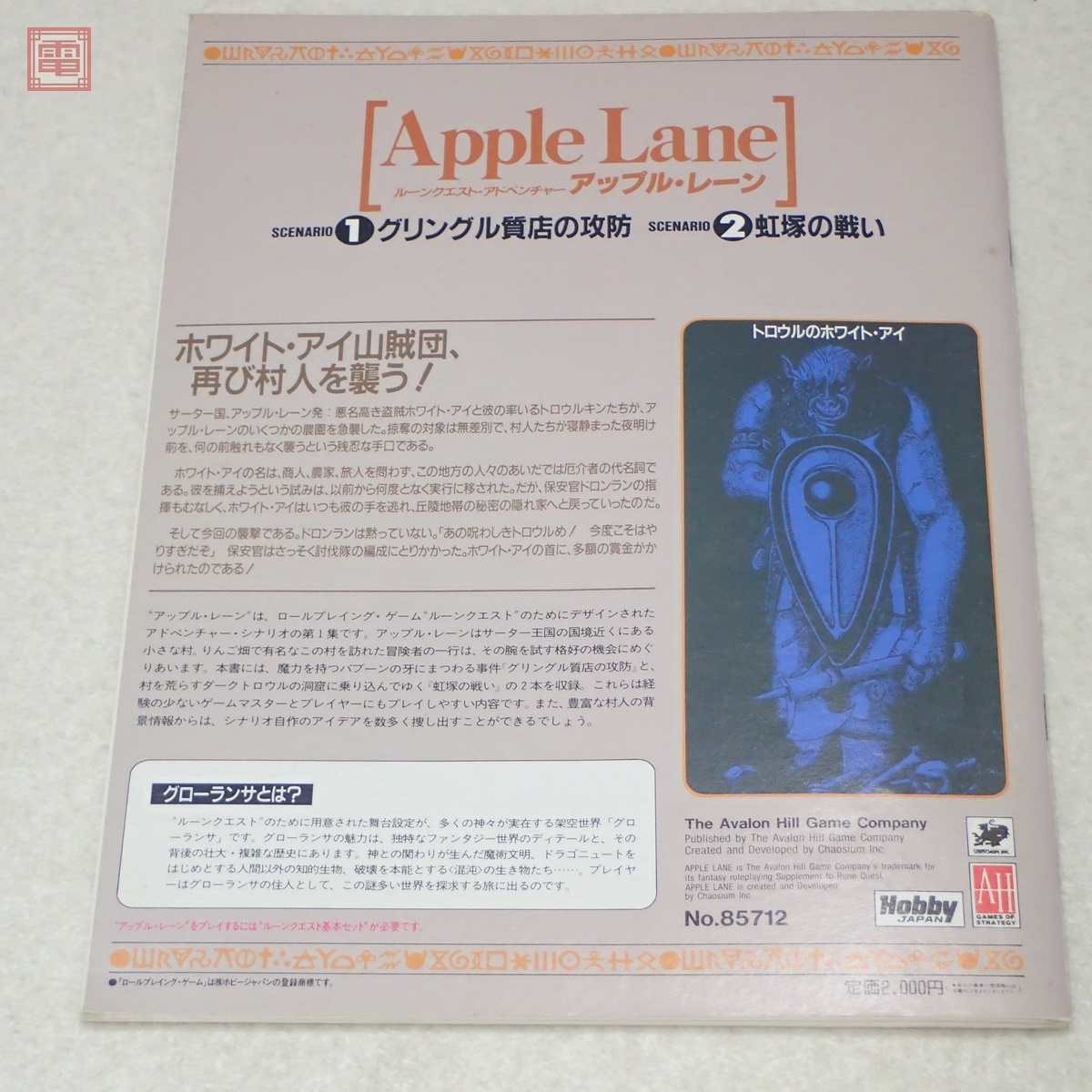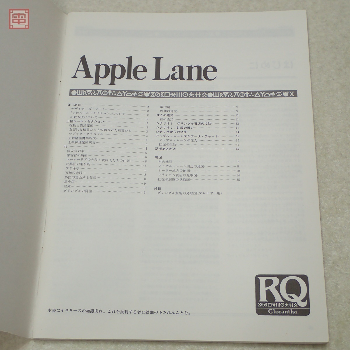 ルーンクエスト・アドベンチャー アップル・レーン Apple Lane アドベンチャー・シナリオ第1集 日本語版 ホビージャパン TRPG No.85712 ■スレ、ヤケ、汚れ等があります。 ■写真のものが全てです。付属物の有無や状態については写真からご判断ください。 ■付属物については細かいチェックはしておりませんので、万が一、欠品があったり余計な物が入っていたとしてもご了承ください。 ■商品到着後、当店の保証期間中は、商品及び箱や取説、付属品などを1つでも廃棄や破損をしないようにお願い致します。廃棄や破損をした場合、商品に問題があった場合でも対応や返金などの対処ができなくなります。 ■商品によりますが、発売されてから10年以上経過している中古品である事をご理解頂いた上でご入札をお願い致します。なお、新品や美品、また特記事項がある場合は別途明記します。 | |||