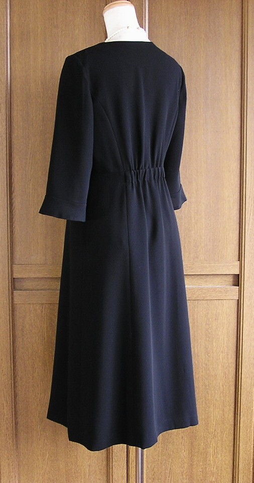 サイズ表記は9号で実寸はワンピースが平置きで肩幅36cm、身幅(脇下で)43cm、ウエスト38cm、ヒップのあたり46cm、着丈106cm、袖丈40cm(7分袖)です。