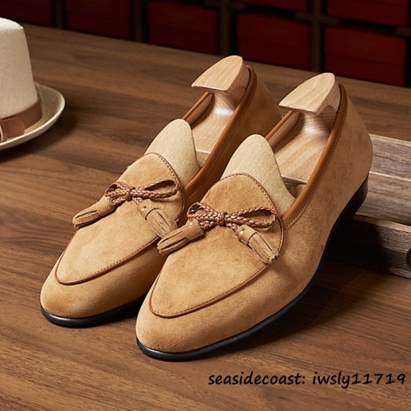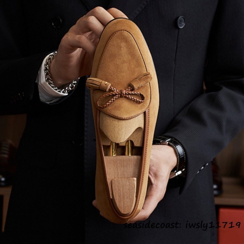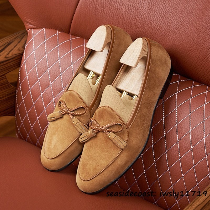 定価10万■最高級 ビジネスシューズ スエード革 職人手作り 本革 レザーシューズ タッセル ローファー 紳士靴 革靴 牛革 ブラウン 26.5cm