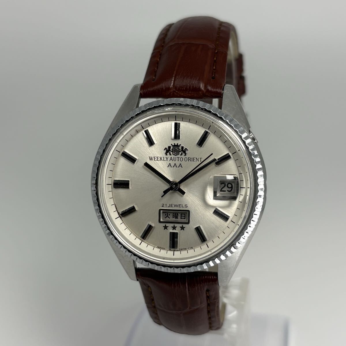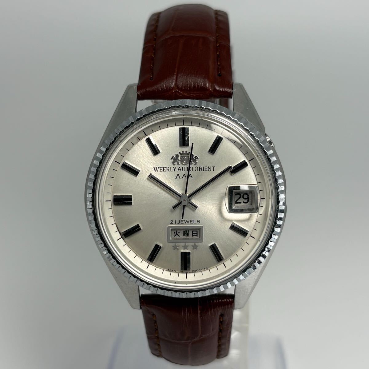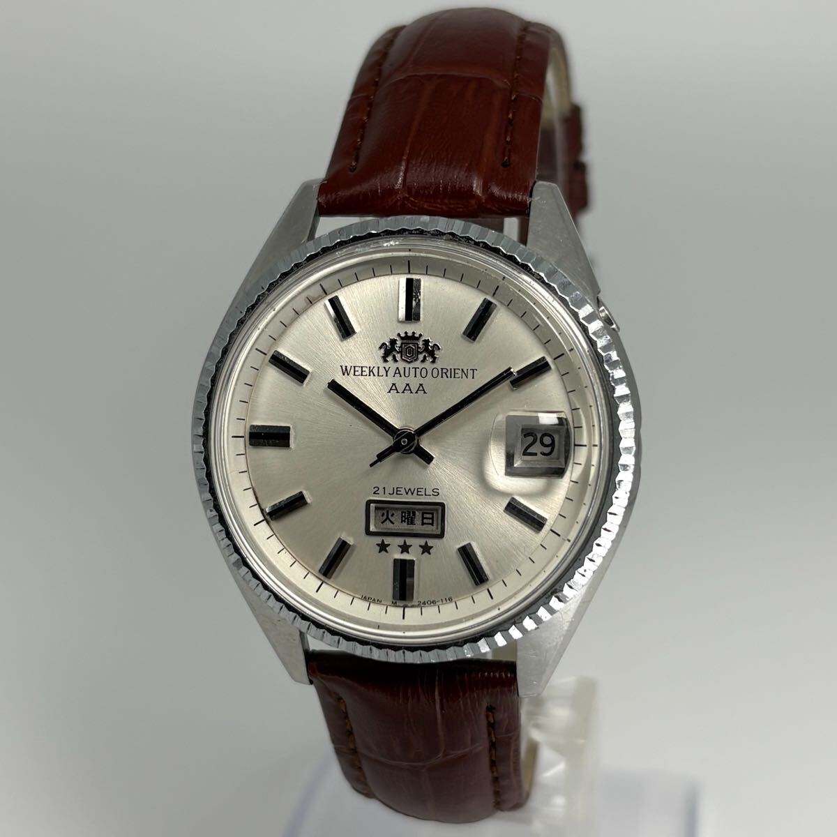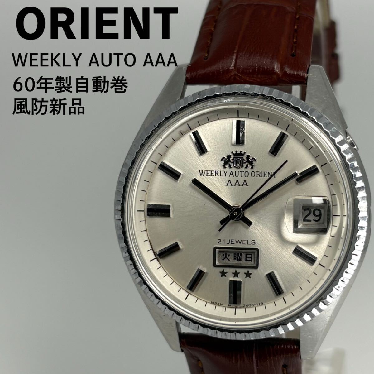 ORIENTの名作「WEEKLY AUTO ORIENT AAA」、1960年代製の自動巻腕時計です。シルバーのサンレイ文字盤に立体的なバーインデックスを配したクラシカルなデザインが魅力。曜日・日付表示付きで実用性も高く、当時のオリエントの高い技術力が感じられるモデルです。風防は新品交換済みで視認性も良好。ブラウンレザーベルトが落ち着いた印象を与えます。国産ヴィンテージならではの存在感と味わいを楽しめる、コレクションにもおすすめの一本です。