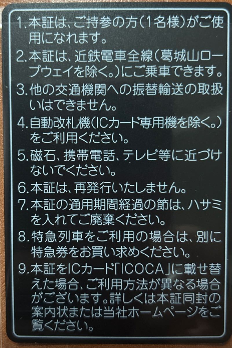 乗車区間:近鉄電車全線(葛城山ロープウェイを除く。)