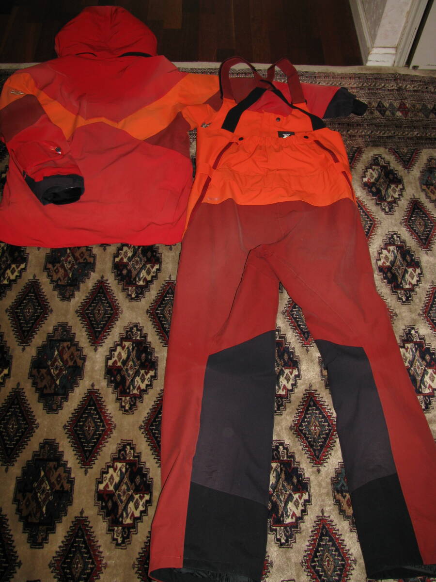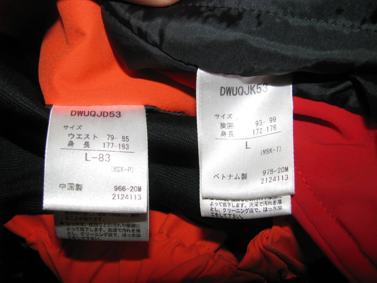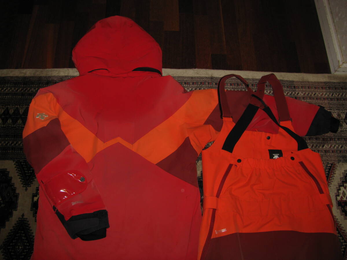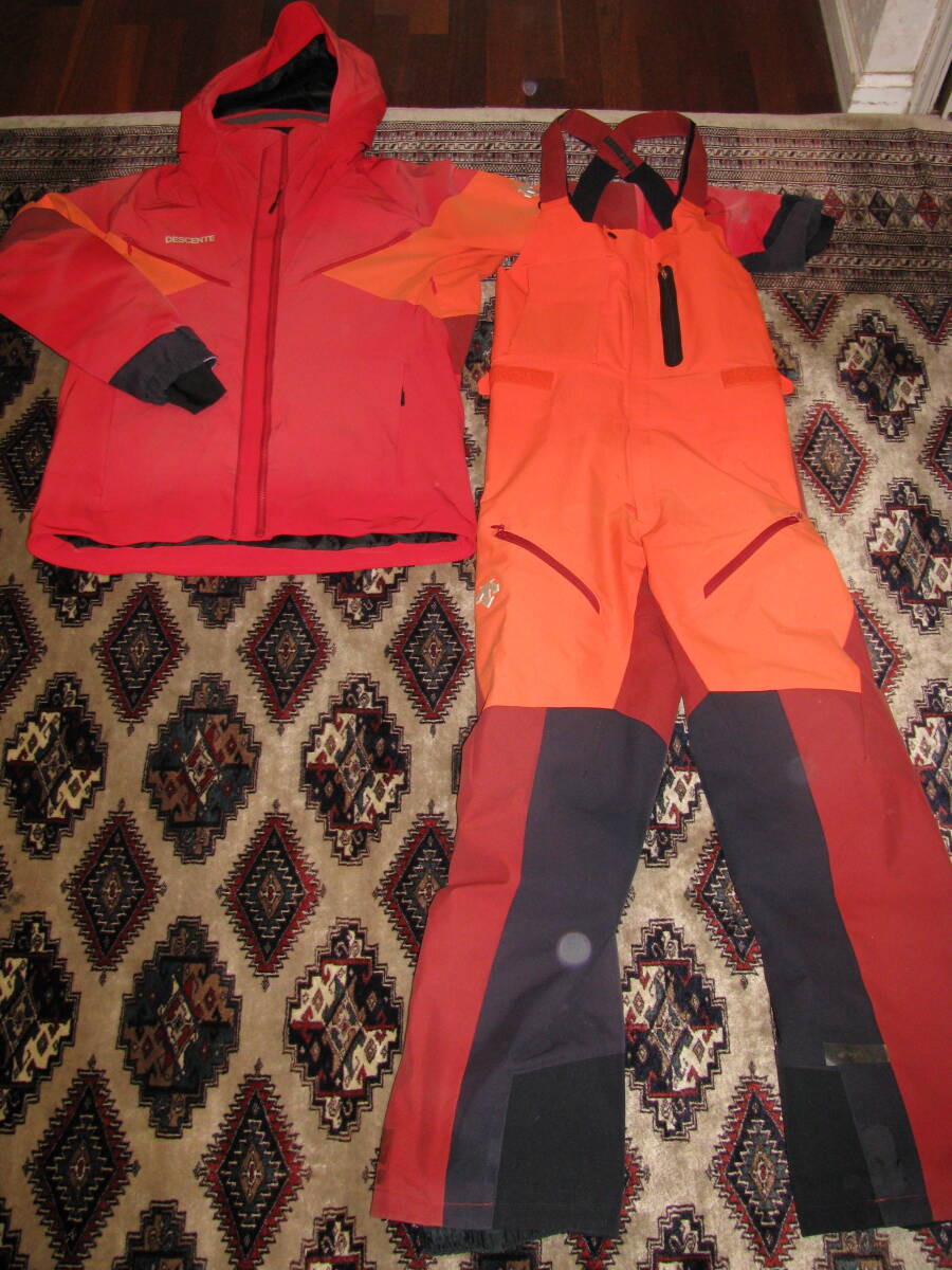 デサントのスキーウェア 上下セット DWUQJD53/DWUQJK53です。色はオレンジXレッド系、サイズは上下ともにL、キズ、汚れ、裾に補修跡などあります、ご了承ください。送料1400円(北海道1800円)でお送りいたします。