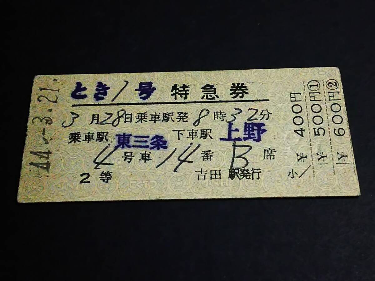 【特急券(2等/準D型)】 「とき」東三条→上野 S44.3.21 吉田駅発行