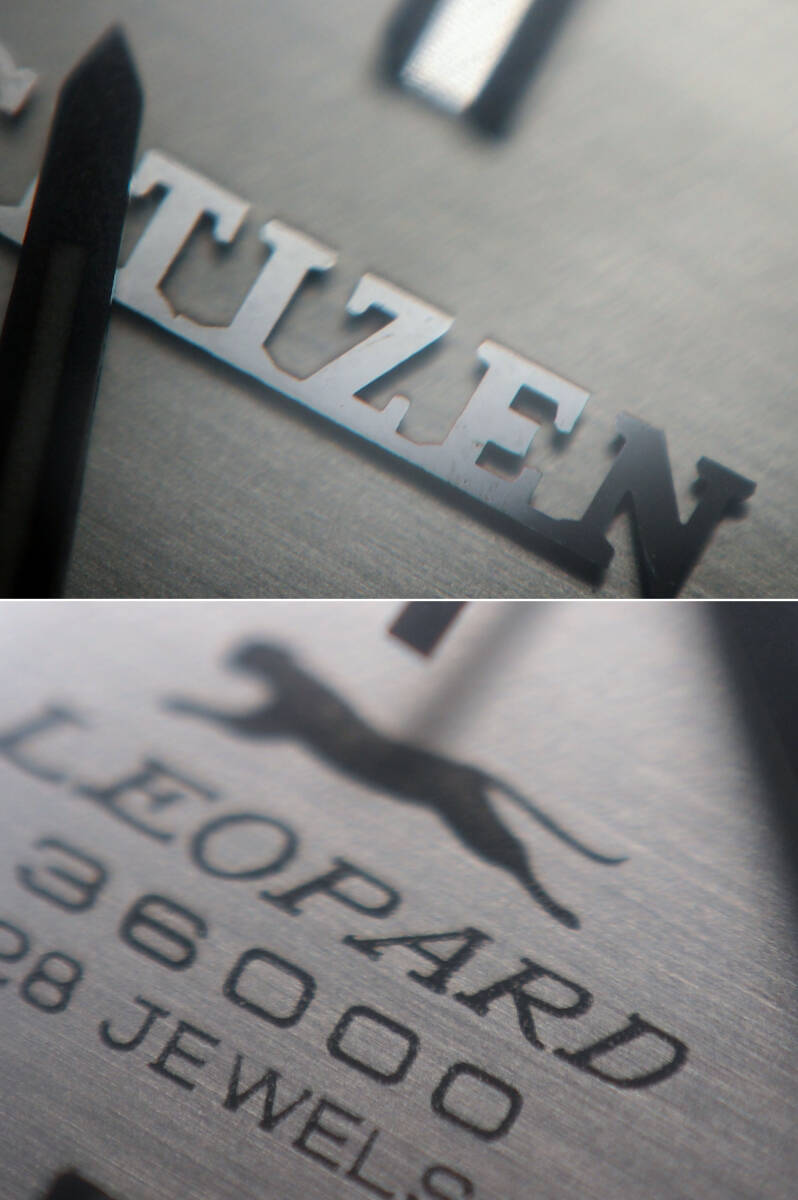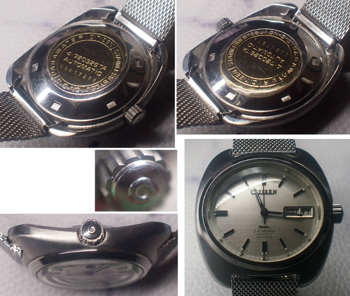 この「レオパール」は、シチズン初の10振動機械(スーパービート10)が搭載されたシリーズで72系「レオパール」の最上級機種として登場します。日付曜日機構が搭載されたウィークデータームーブで、ムーブメントの「Cal. 7230」は6振動や毎時28800振動(8振動)機に比べ、ハイビート化されているので、各パーツ等のグレードアップ化がされ、高級機に相応しい仕上げのムーブメントになっています。そして、高級機の代名詞ともいわれる微動緩急装置に秒針規制装置も搭載され、風防はクリスタルガラスになっています。