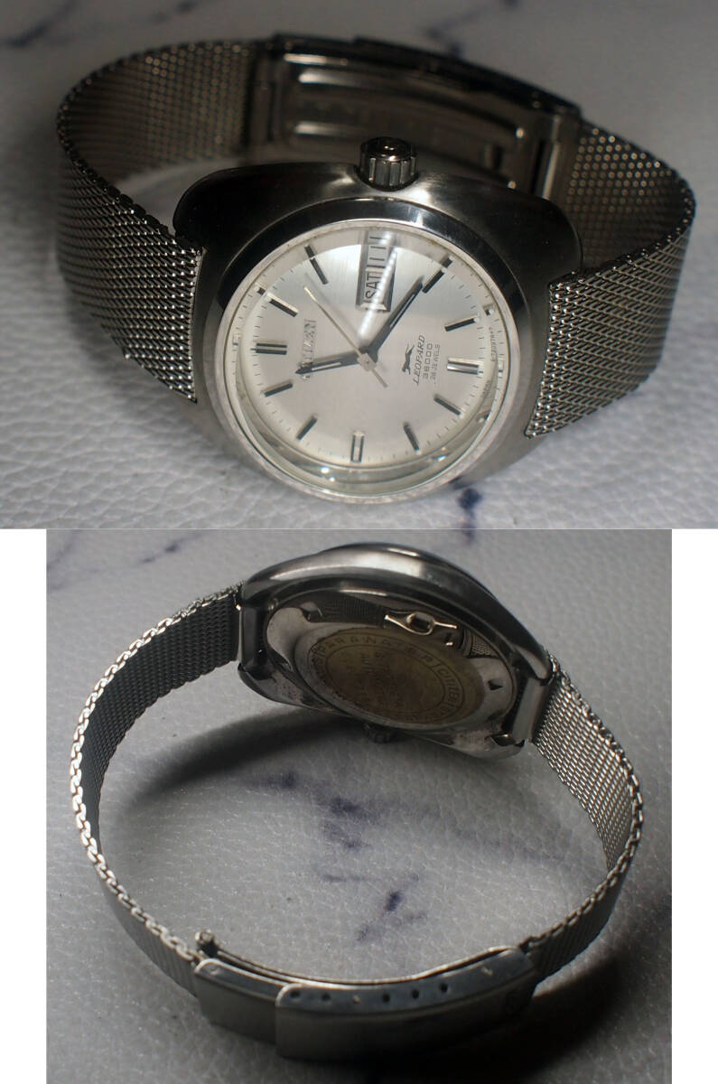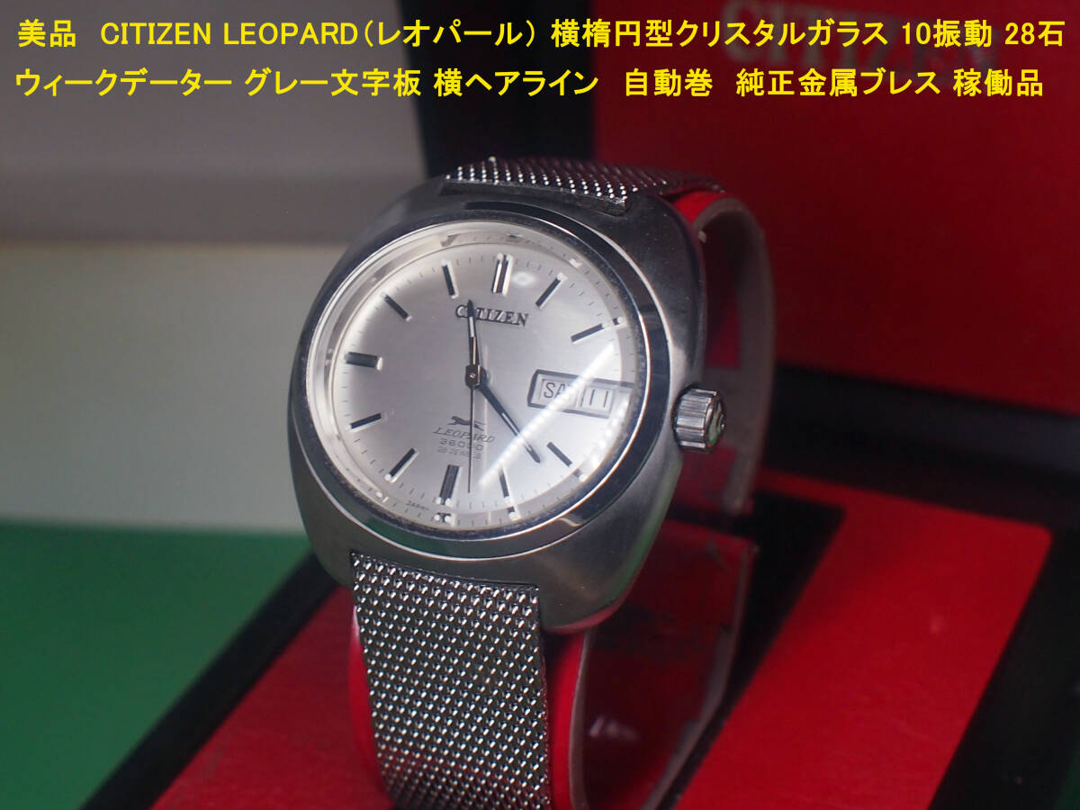 美品 CITIZEN LEOPARD(レオパール) 横楕円クリスタル 10振動 28石 ウィークデーター グレー 横ヘアライン 自動巻 純正ブレス 稼働品