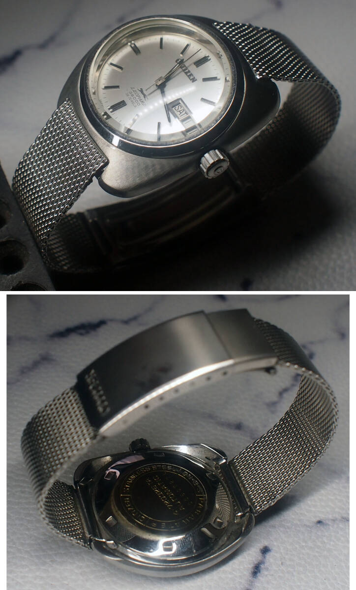 希少な純正・CITIZENロゴ入り金属ブレス(画像7トンボ本参照)も綺麗です腕周りは18.5cmにしていますが、バックル部で大小どちらにも調整可能です(延長菅付きですので、外せばさらに小さくすることも可能です)。