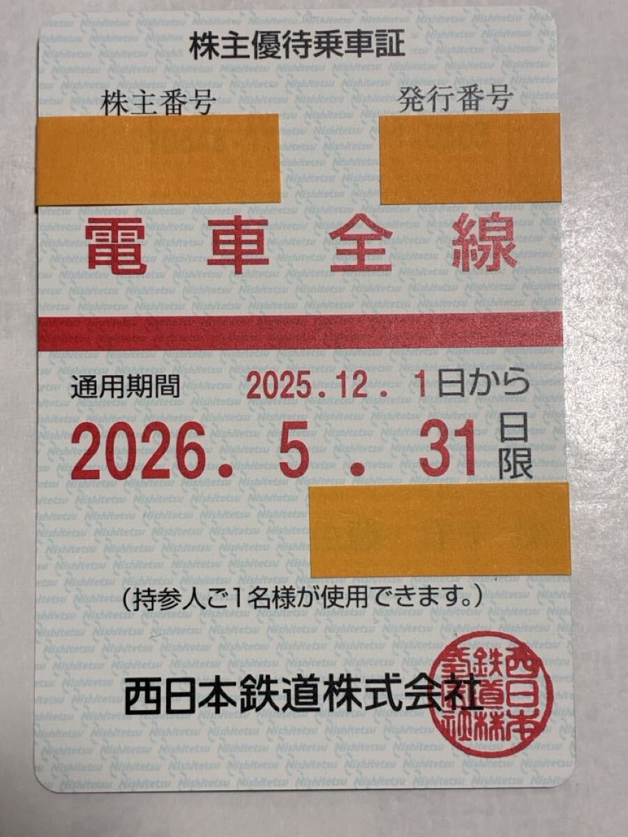 西日本鉄道株式会社の電車全線 株主優待乗車証です。