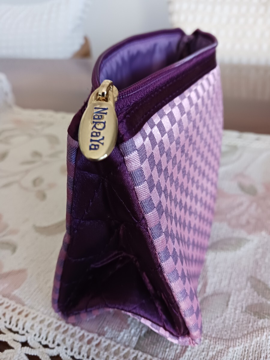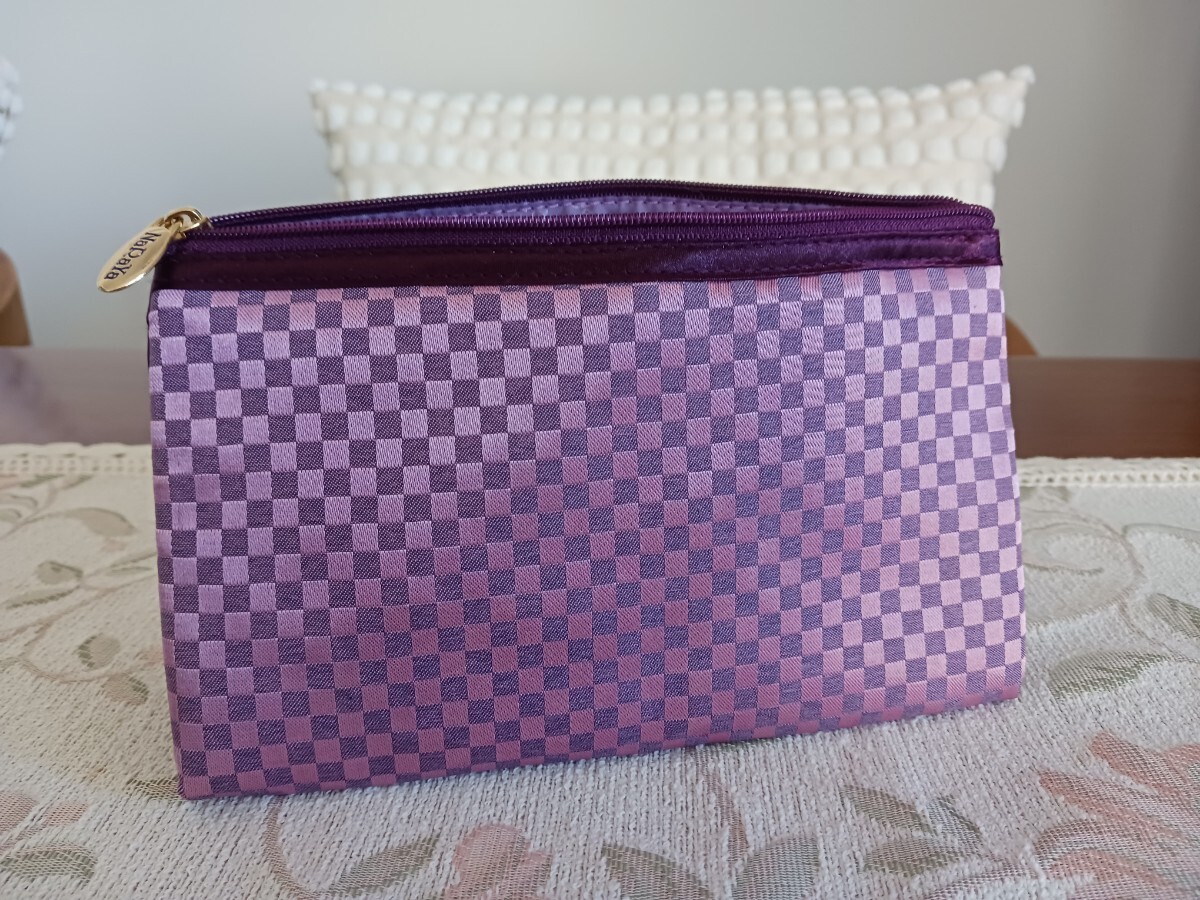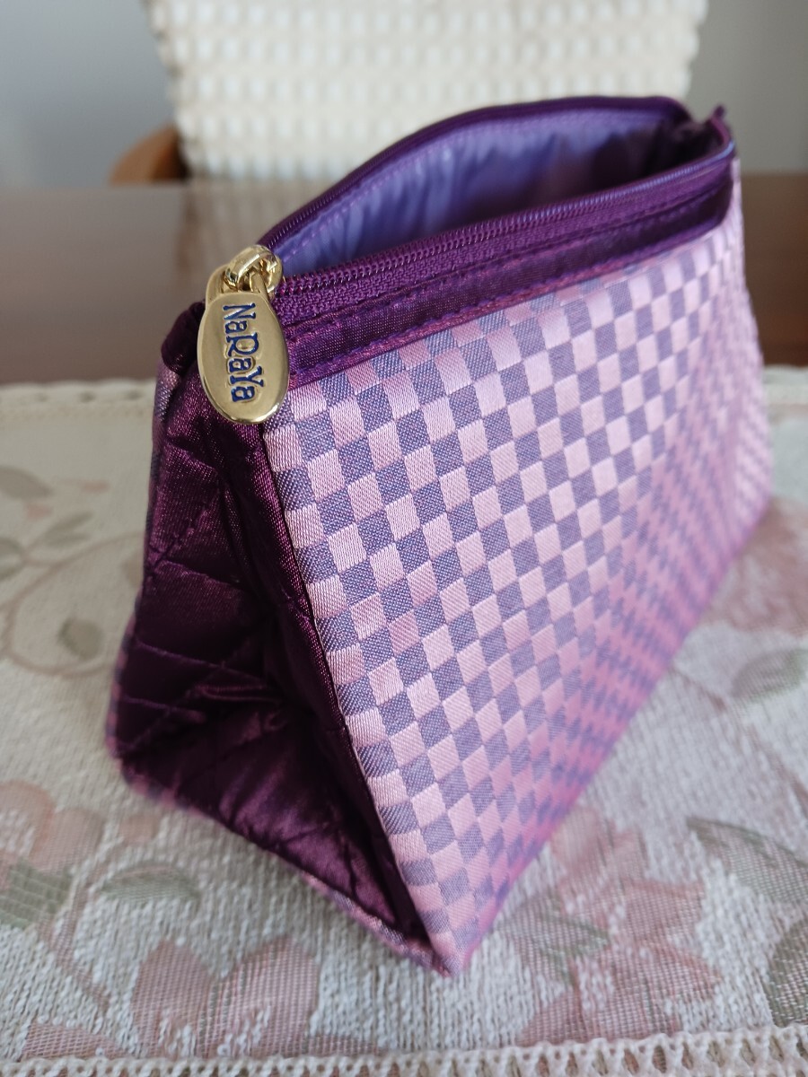 紫とピンクのチェック柄のサテンポーチ、立体的なデザインで収納力があります。