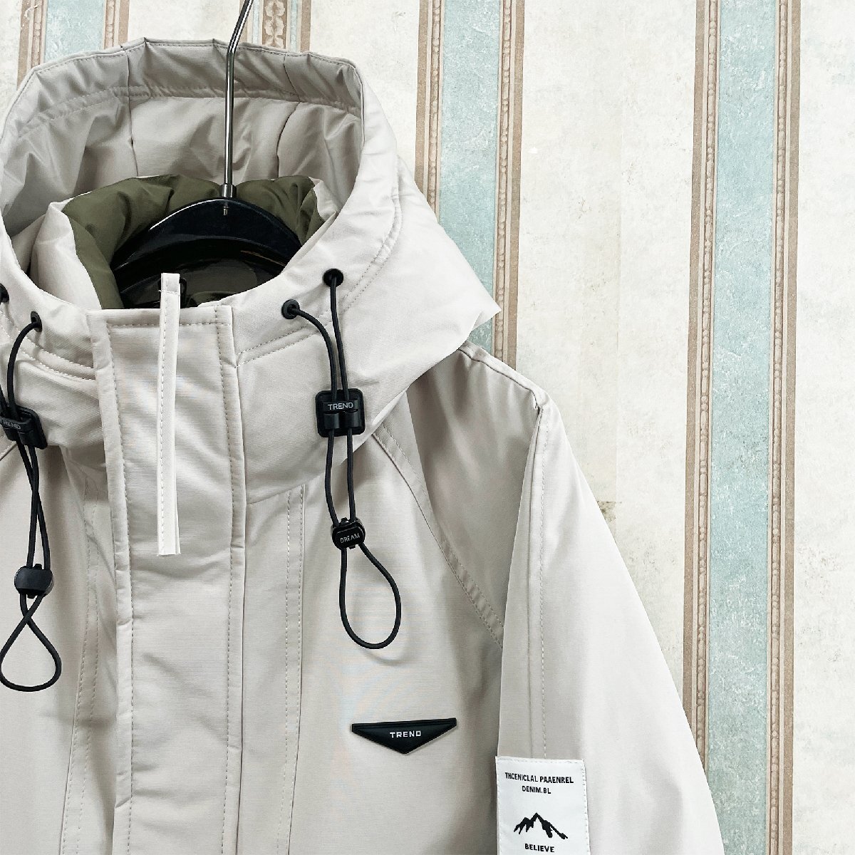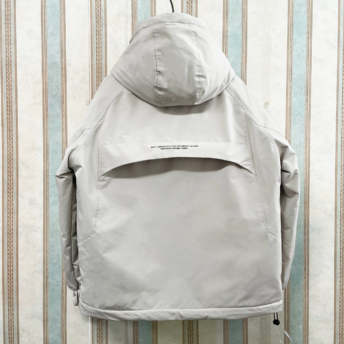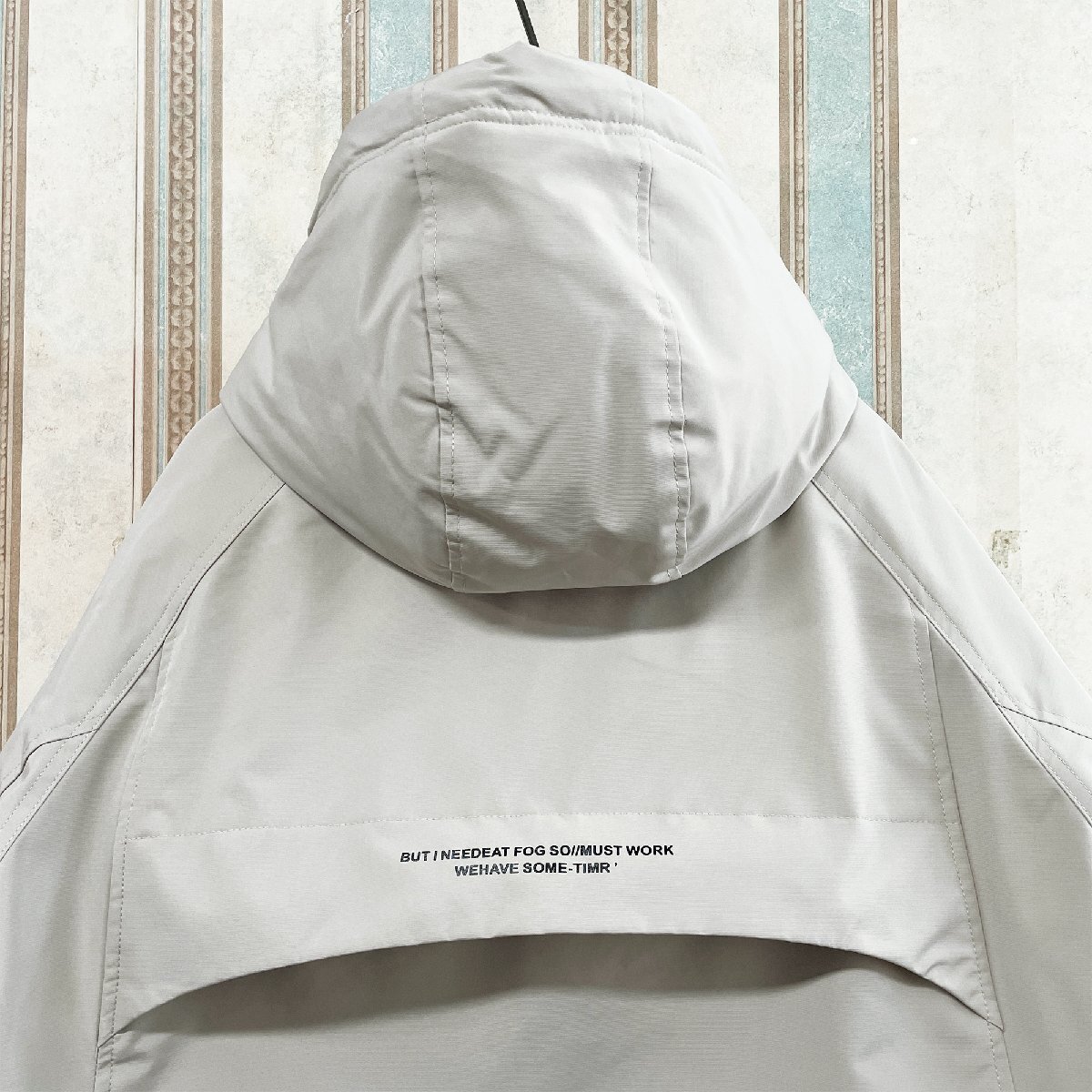 ダウンジャケットと一体のフードと裾には、ドローストリングが付いており、引き締めることで寒風の侵入を防ぐことができます。両サイドには大容量のジップポケットがあり、収納力が抜群です。内側には隠しポケットもあり、貴重品を安心して収納できます。左袖とバックの英字はポイントで、カジュアルスタイルがこなれ感のある印象に。