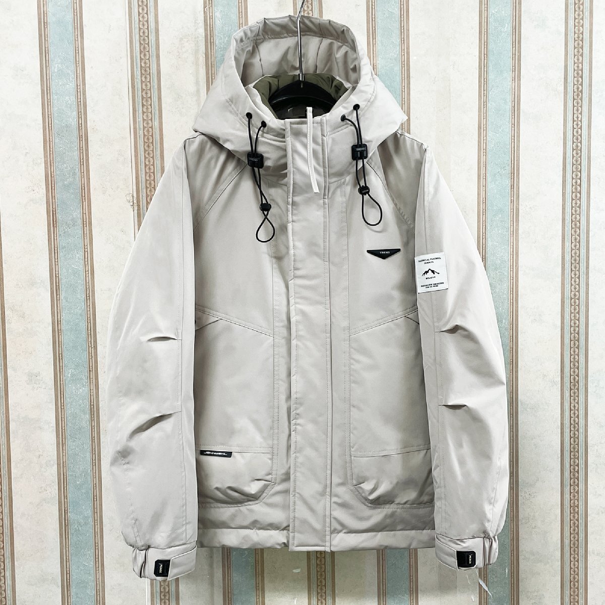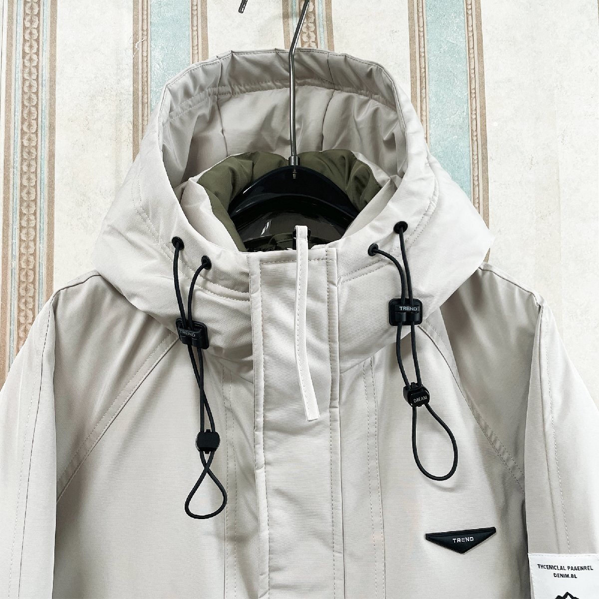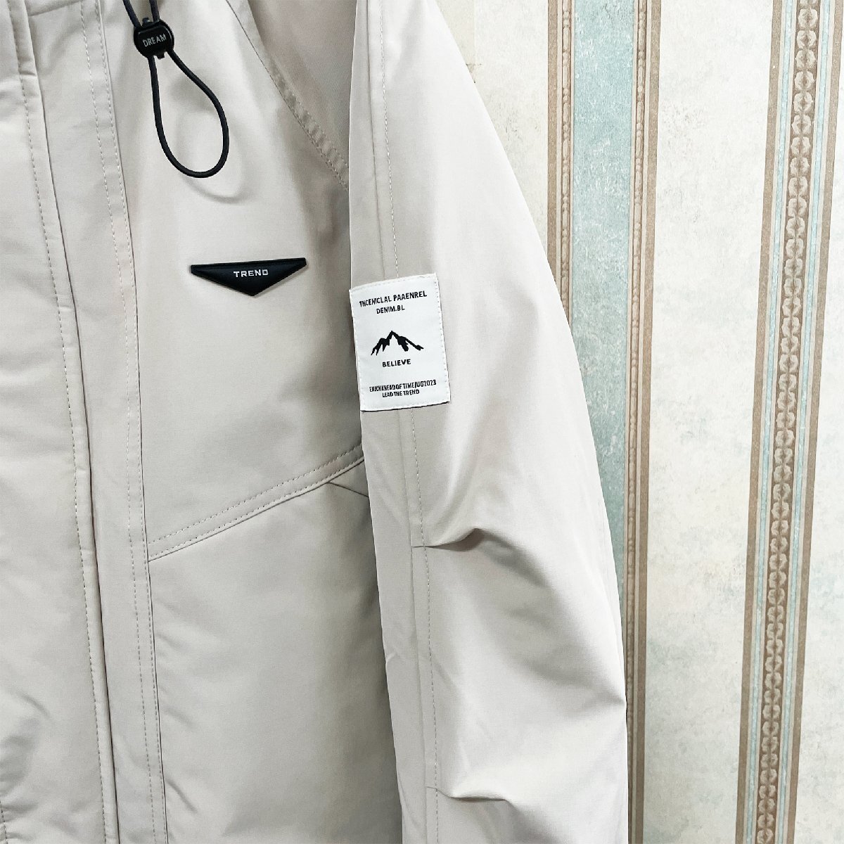 ダウンジャケットと一体のフードと裾には、ドローストリングが付いており、引き締めることで寒風の侵入を防ぐことができます。両サイドには大容量のジップポケットがあり、収納力が抜群です。内側には隠しポケットもあり、貴重品を安心して収納できます。左袖とバックの英字はポイントで、カジュアルスタイルがこなれ感のある印象に。