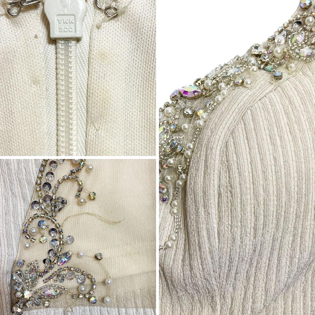 左胸についていたパールチェーン1本取れ、裾の装飾に一部取れがあります。