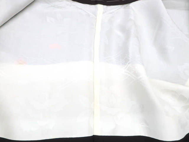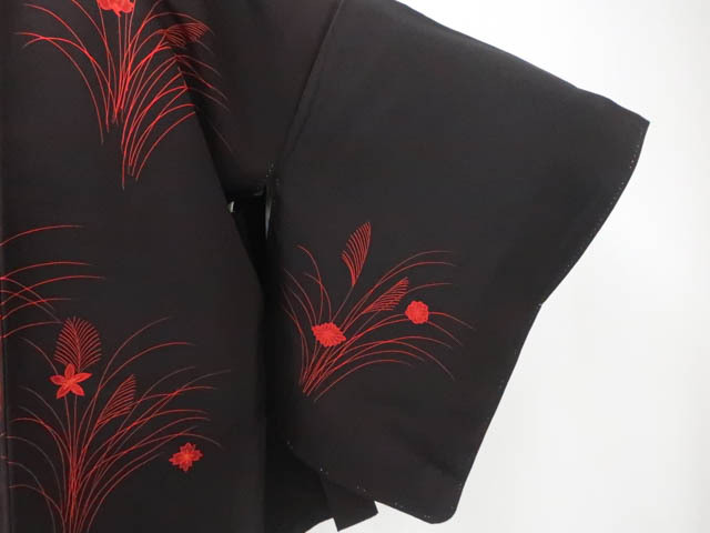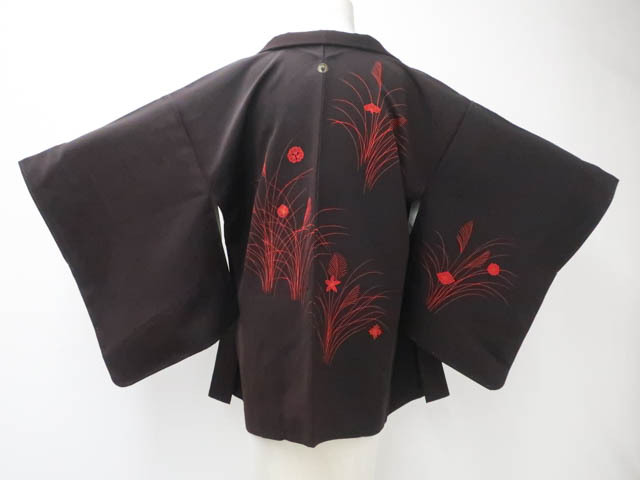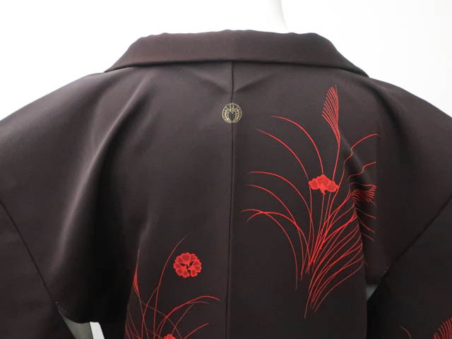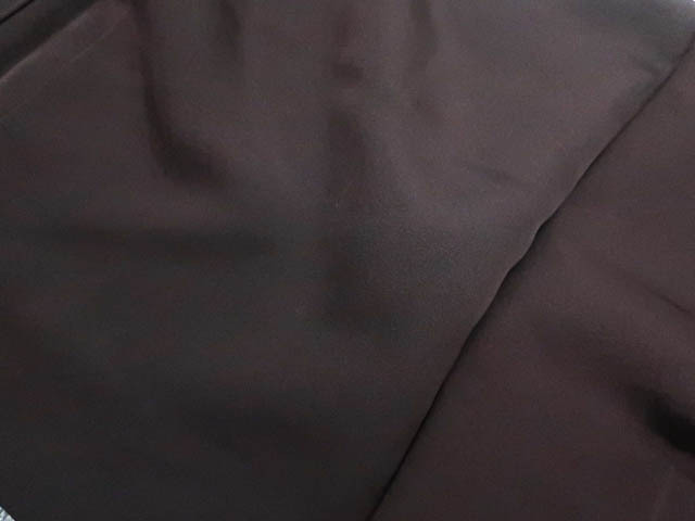 リサイクル商品のため、裾返り薄汚れがございますがご着用いただけると存じます。 地色は焦げ茶です。 1枚目の画像が近いお色かと思われます。 素材は正絹です。 |