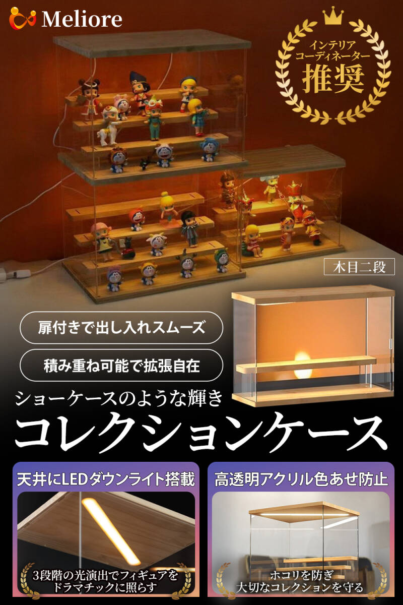 フィギュアケース 棚 LED コレクションケース 【インテリアコーディネーター推奨】 幅32cm 木目 2段 ディスプレイケース 調光 色温度