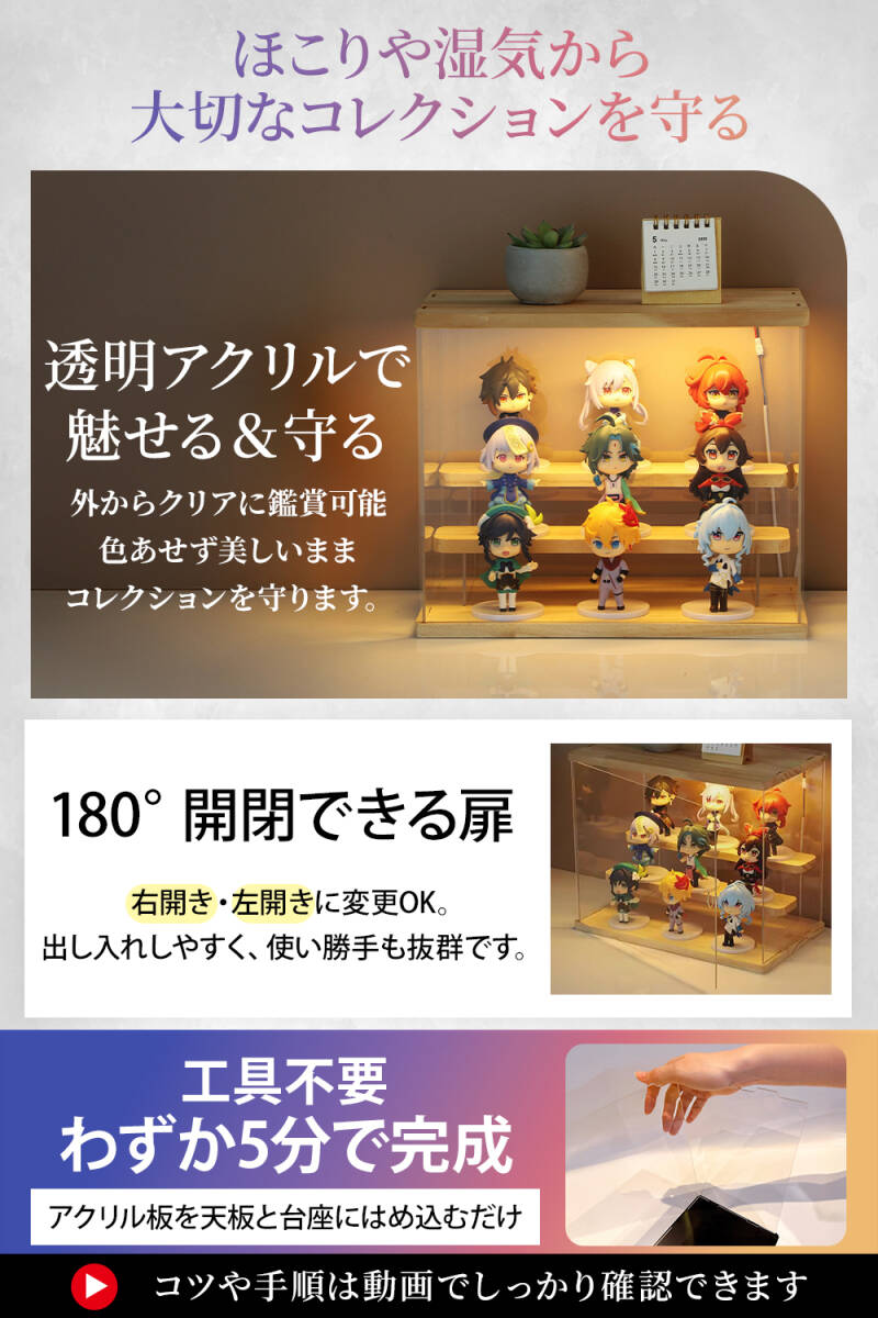 工具も接着剤も不要でアクリル板を天板と台座にはめ込むだけで、わずか5分ほどで完成します(※組み立て手順、注意点は動画を参照)。段差付きのひな壇が付属しているので、奥に飾ったコレクションも見やすくディスプレイできます。扉からの出し入れもスムーズで、お手入れやレイアウト変更もラクラク。積み重ねも可能なので、コレクションが増えても安心です。