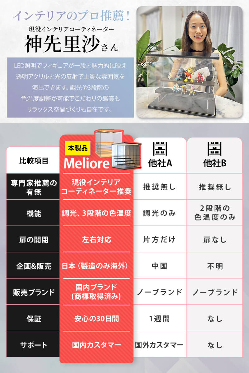現役インテリアコーディネーターの神先里沙さんから次のような評価をいただきました。『こちらのコレクションケースを使用してみました。まず、LED照明付きでフィギュア達がより魅力的に見える演出が可能です。透明のアクリル板とLEDの光が反射し、上質な雰囲気を作り出すことができますので、コレクターの方にもピッタリな商品ですね。調光タイプで簡単に光の強弱を変えることができ、3段階の色温度調整もできるため、フィギュアの見え方にこだわられる方や、リラックスした雰囲気での鑑賞を楽しみたい方にもおすすめできます。また、扉付きなので簡単にフィギュアの入れ替えができるということも安心です。アクリル製のため軽やかに操作を行えることも、老若男女問わず使いやすい商品です。』