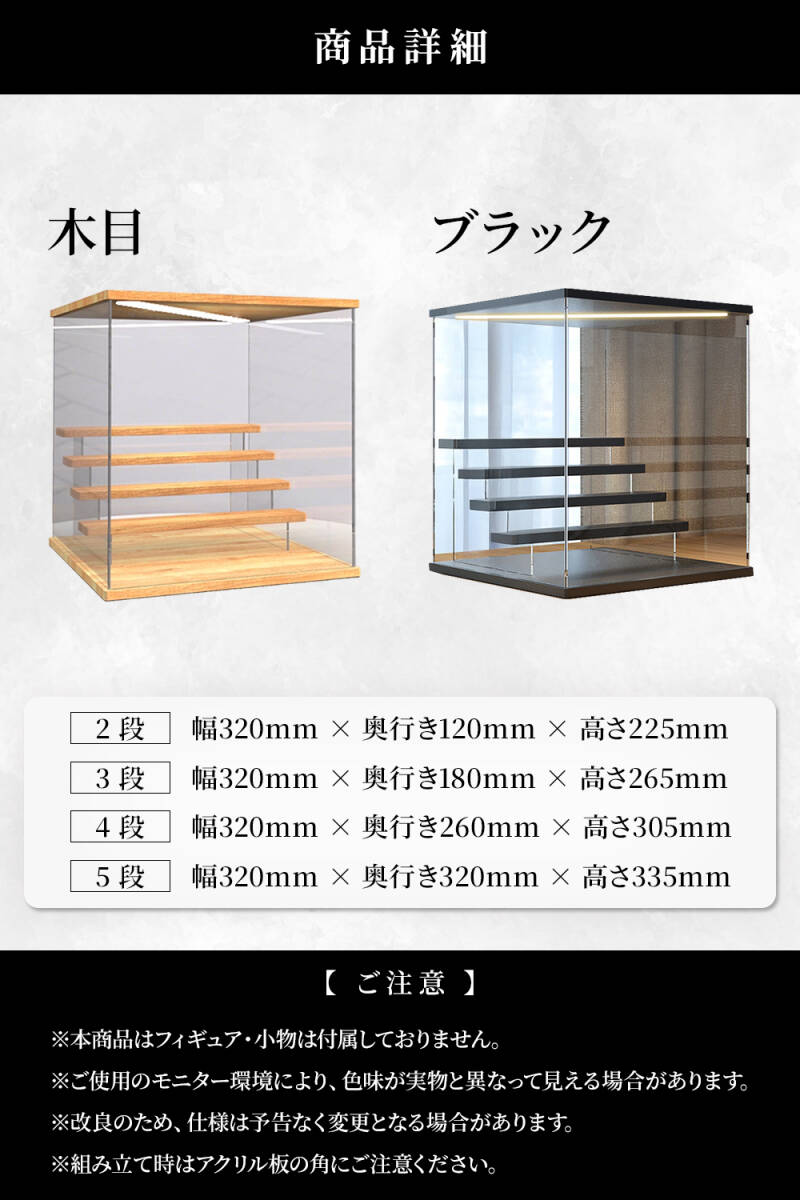 サイズ(外寸):2段(幅320mm×奥行き120mm×高さ225mm)、3段(幅320mm×奥行き180mm×高さ265mm)、4段(幅320mm×奥行き260mm×高さ305mm)、5段(幅320mm×奥行き320mm×高さ335mm) / カラー:ブラック、木目 / 材質:板部分(アクリル)、フレーム(木製プラスチック)