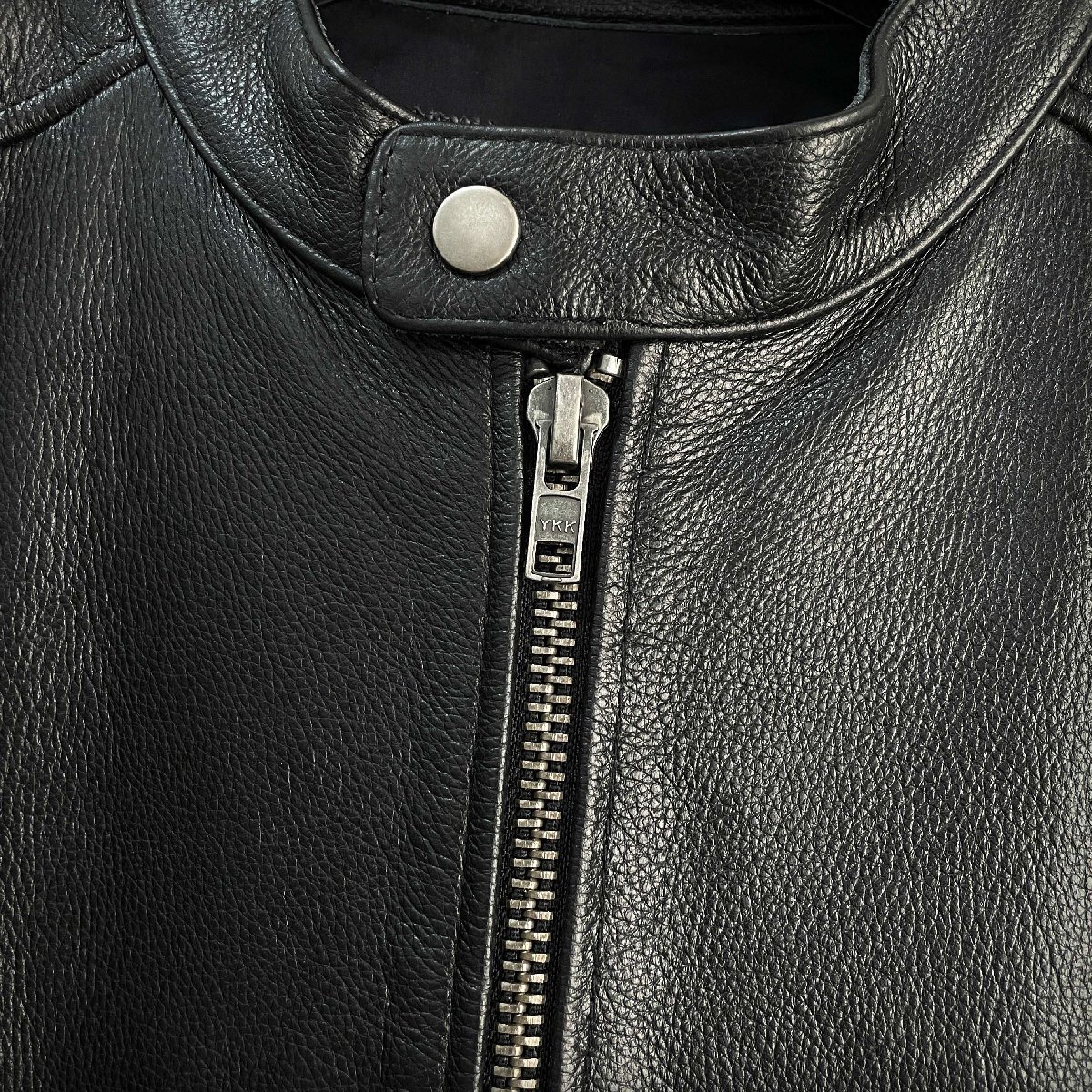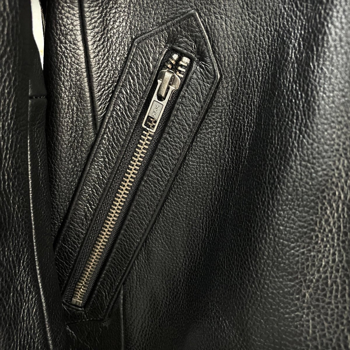また、フロント、両サイドと両袖口に配置されたYKKファスナーが重量感のある羊革の生地との相性もよく、ハードで男らしい雰囲気を演出。