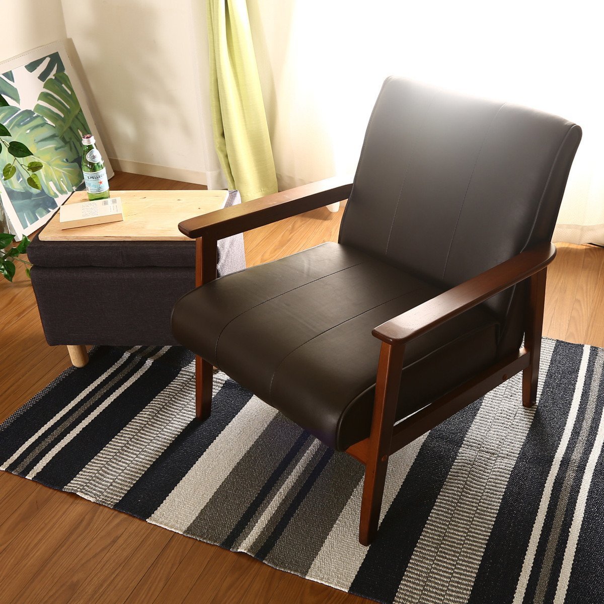 | 素 材 | 張地:合成皮革(バイキャストPU) フレーム:天然木 座面:ウェービングベルト/ウレタンフォーム 背面:ウレタンフォーム 肘部・脚部:天然木(ラバーウッド) |