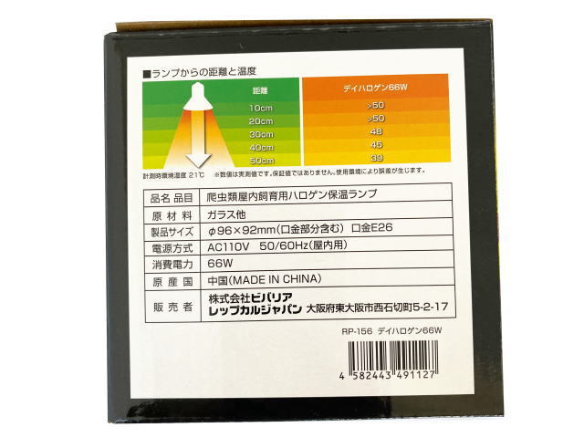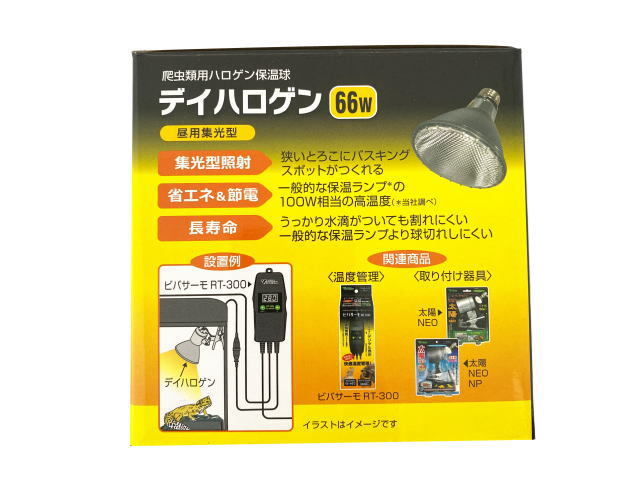 | 商品名:デイハロゲン 66W 爬虫類用ハロゲン保温球 昼用集光型 ・集光型照射 狭い所にバスキングスポットがつくれる ・省エネ&節電 一般的な保温ランプに100W相当の高温度 ・長寿命 うっかり水滴がついても割れにくい一般的な保温ランプより 球切れしにくい ・関連商品(別売り) 取り付けお勧め 太陽NEO クリップスタンド 温度管理お勧め ビバサーモRT-300 ■商品仕様 品名:爬虫類屋内飼育用ハロゲン保温ランプ 原材料:ガラス他 製作サイズ:Φ96x92mm(口金部分含む)口金E26 電源方式:AC110V 50/60Hz(屋内用) 消費電力:66W 原産国:中国 |