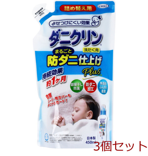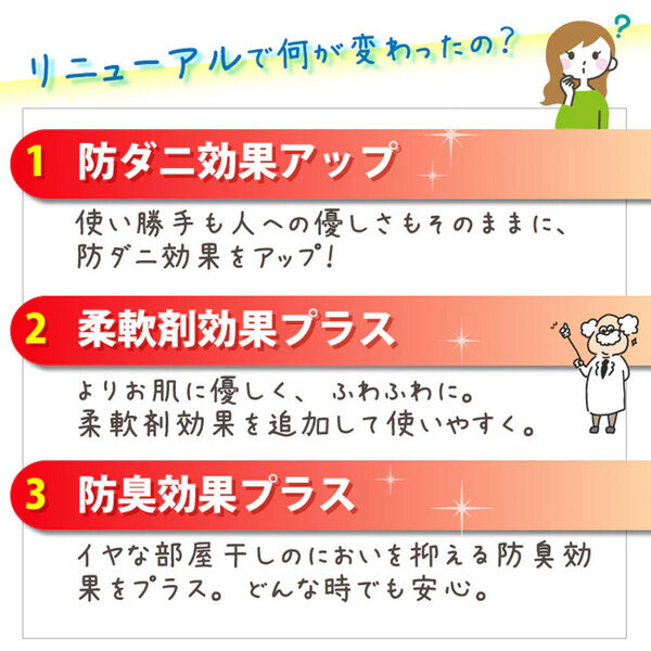 ハウスダストのもとにもなるダニから、衣類や寝具類をガード。 ダニを「よせつけにくい効果」をシーツやカバーに持たせ、ダニが布団からシーツ類に移ったり、タタミやマットから寝具類に侵入するのを防ぎます。 ・殺虫成分・香料不使用。 ・柔軟効果がプラス。 ・抗菌・防臭効果で部屋干し臭・生乾き臭をすっきり。 ・肌への刺激が少なく口に触れても大丈夫な成分です。 ・すすぎの時に入れるだけ。 柔軟剤、漂白剤、糊剤も一緒に使えます。 ・洗えるカーペット・マット類にもお使いいただけます。 ・頻繁にお洗濯しないものは約1ヶ月効果が持続します。 (UYEKI社テストによる) 個装サイズ:140X220X65mm 個装重量:約465g 内容量:450mL 製造国:日本 【発売元:株式会社UYEKI】 【品名】 洗濯用防ダニ加工剤 【用途】 洗濯できるシーツ・カバー・タオルケット・毛布・カーペット・マット類・衣類 【成分】 脂肪族系カルボン酸エステル、抗菌剤、柔軟剤 【使用方法】 ※必ずダニクリンまるごと防ダニ仕上げPlus500mlの本体容器に詰め替えてください。 ★全自動洗濯機、ドラム式洗濯機 ・柔軟剤投入口に本品を入れ、洗濯します。 ★2槽式洗濯機 ・すすぎの水がきれいになったら本品を入れ、注水を止めて約5分間まわします。 ★脱水後 ・天日で自然乾燥させてください。 (乾燥機を使用すると有効成分が多少損なわれます。) ※本品を投入するときのすすぎの水は水道水をお使いください。 ※衣類とシーツ類を一緒に洗濯するときでも本品をご使用いただけます。 (衣類に本剤が吸着しても問題ありません。) 【応急処置】 ・万一飲み込んだ場合はすぐに水を飲ませる等の処置をする。 ・目に入った時は流水で洗い流す。 ・身体に異常を感じた場合はすぐに使用をやめる。 ・いずれの場合も本品を持参して医師に相談する。 【使用上の注意】 ・上記の用途以外には使用しない。 ・肌に合わない場合や匂いが気になるときは使用をやめる。 ・子供の手が届かない、直射日光を避けた場所に保管する。 ・凍結したり高温になる場所には保管しない。 注意事項 予告なく成分・パッケージが変更になることがございます。 予めご了承ください。 *予告なく成分・パッケージが変更になることがございます。予めご了承ください *ダンボールを使用して発送する場合には、入数以下の個数の場合、 中古ダンボールを使用する場合があり、ご注文の商品とは異なるダンボールになる場合があります。 あらかじめ、ご了承ください。 |