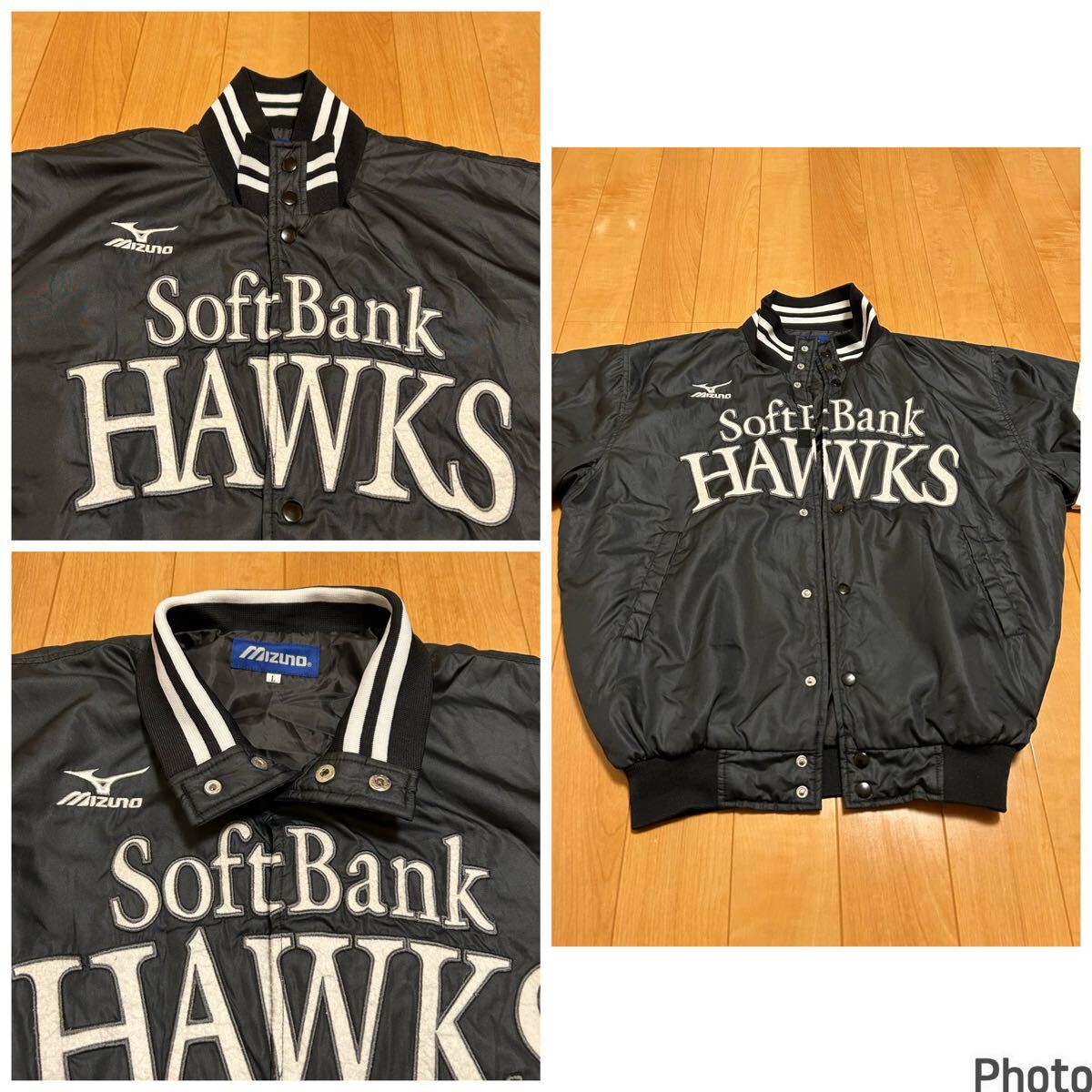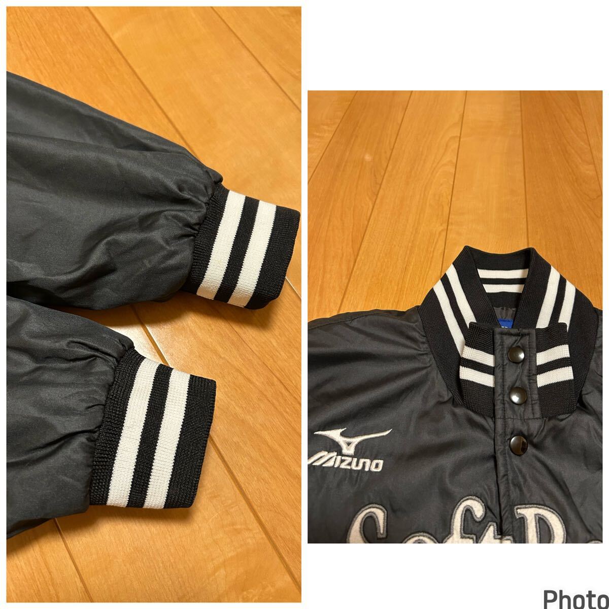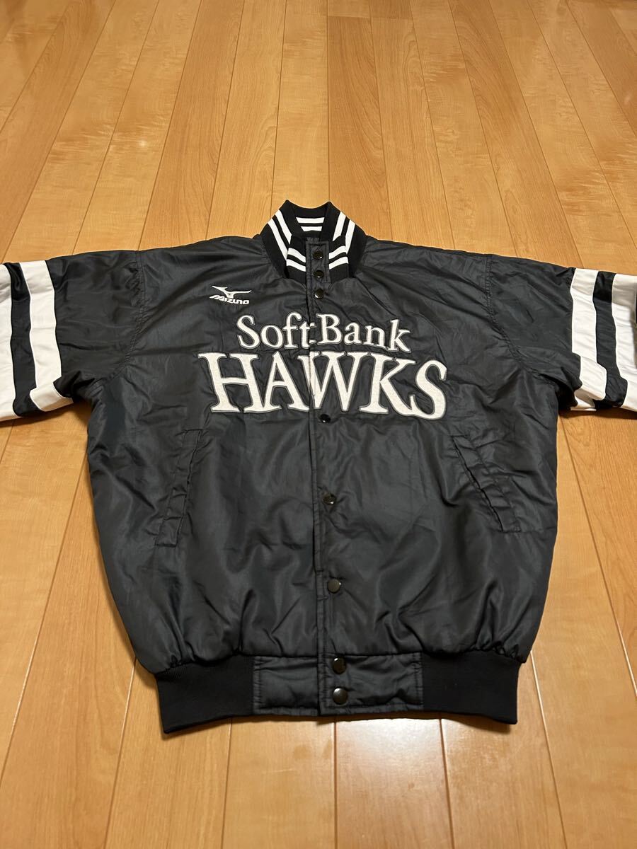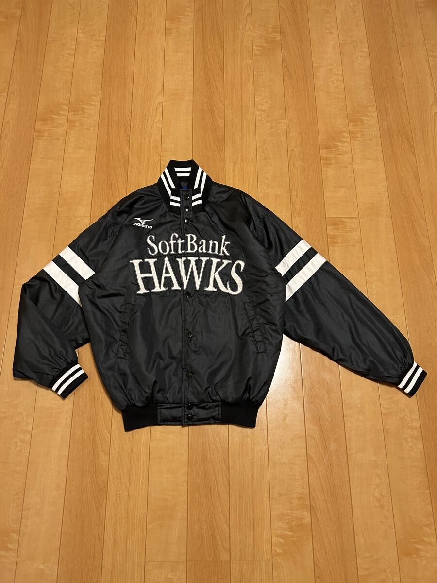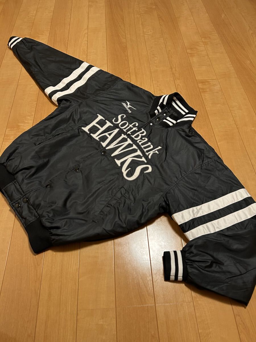 良品☆ミズノ製/福岡ソフトバンクホークス サイズL大き目 肉厚中綿入.ナイロンスタジャン ロゴ刺繍ワッペン 黒 グランドコート