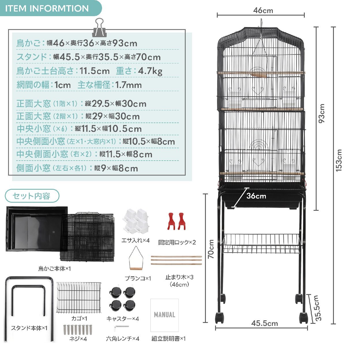 | 商品名:鳥かご バードケージ 鳥小屋 複数飼い 大きいケージ 大型 インコ セキセイインコ オカメインコ 文鳥 小鳥 ケージ ゲージ 93×46×36cm白 移動に便利なキャスター、収納に便利なカゴ付き専用スタンドが付属いたします。 底網付きで、トレーは引き出し式のため掃除がカンタン。 カナリヤやセキセイインコなどの小鳥の多数飼育でも広々。オカメインコなどでもたくさん飼育できます。 4つのプラスチック製エサ入れと3本の木製止まり木、ブランコが付属。 2枚の大窓で鳥の出し入れがしやすく、隅々までお掃除可能! 12枚の小窓で小物の配置も自由自在。 持ち手付きでお手軽に移動できます。 組立説明書をお付けいたしますので簡単にご使用いただけます。 ●製品仕様 サイズ(約): 鳥かご 高さ93×幅46×奥行き36cm 専用スタンドに乗せた場合 高さ153×幅46×奥行き36cm 重さ4.7kg 付属品: 鳥かご本体(スチール製) 専用スタンド(スチール製) トレー(プラスチック) 止まり木:3本 プラスチック製のエサ(水)入れ:4個 ブランコ:1個 固定用ロック:2個 組み立て説明書 |