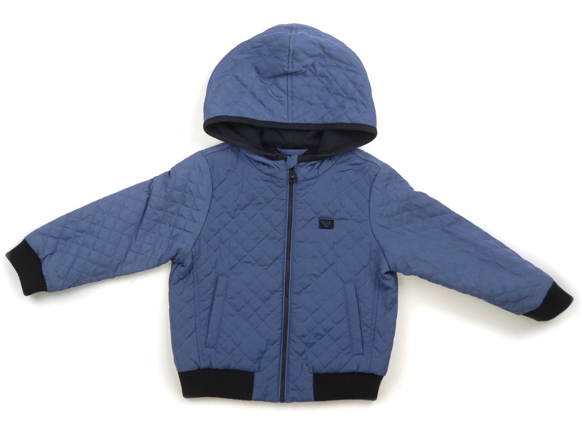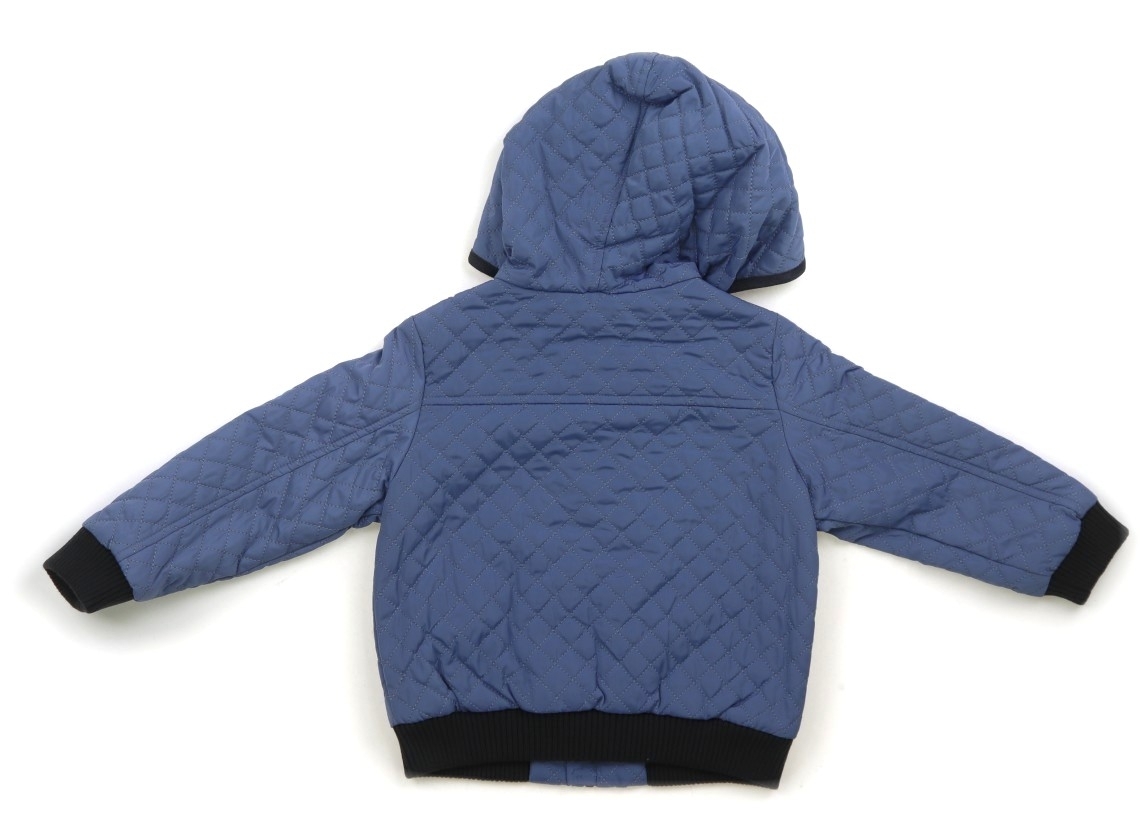 キルティング素材で、カットソーの裏地付き。フードは欠損しております。実際のサイズ表記は24m/92です。バスト付近に2cmほどの汚れあり。若干の色あせがありますが、まだお使いいただけそうです。