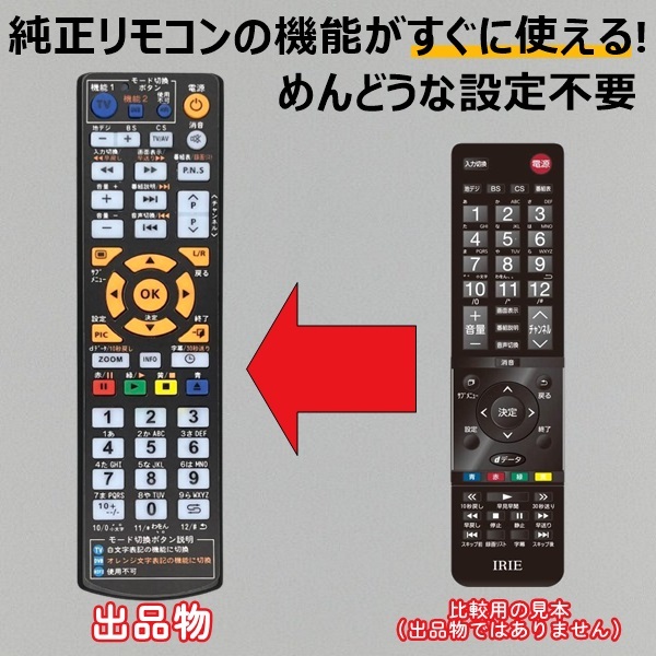 | 【商品名】 IRIE FFF-TV 代替リモコン 【対応機種】 FFF-TV24SBK FFF-TV24SBK2 FFF-TV32SBK FFF-TV32SBK2 FFF-TV32SWH2 FFF-TV4K50WBK FFF-TV4K55WBK FFF-TV4K50WBK2 FFF-TV4K55WBK2用 比較画像の右側の純正リモコンが付属する機種に使用出来ます。 上記機種以外については、質問欄よりメーカーと型番をご連絡頂ければ、対応品のご案内をしております。 【商品について】 左側の代替リモコンが出品物になります。右側のリモコンは見本画像です。 タイトル機種のリモコン信号を入力した、設定不要で使える純正品と同等の代替リモコンです。 乾電池は付属しません。別途ご用意下さい。(単4乾電池×2本) 【商品サイズ】 縦18.5cm×横5cm×高さ2.35cm 【発送について】送料無料 迅速発送を心掛けております。土日祝日はお時間を頂く場合ございます。 ポスト投函配達となり、日時指定は出来ません。 | ||