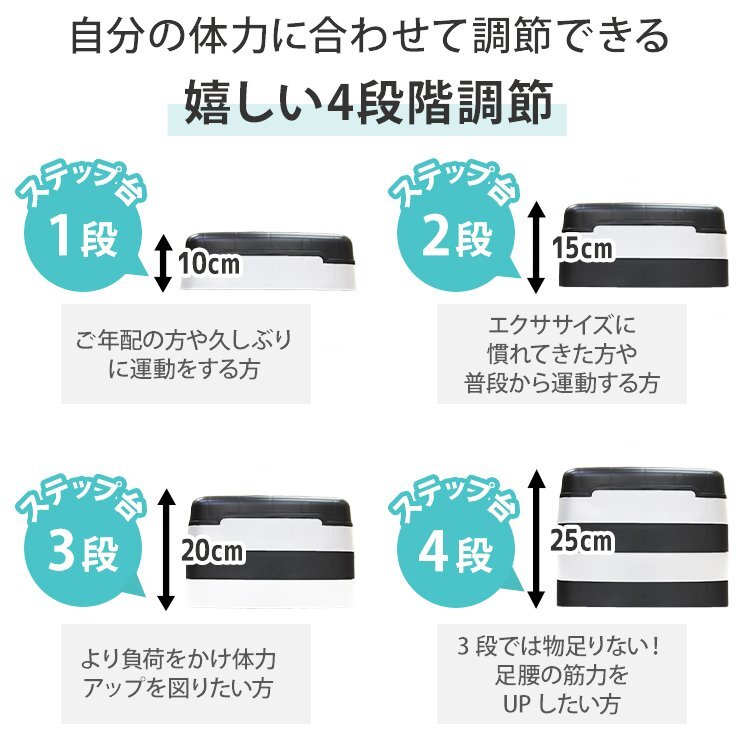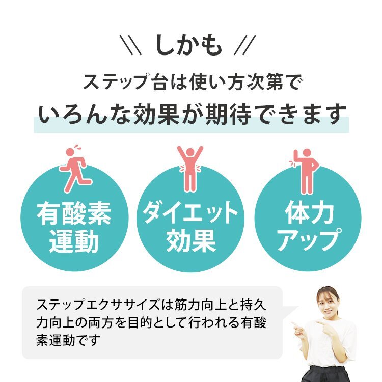 \ 室内で気軽にステップ運動ができるエクササイズステップ / テレビを観ながら、好きな音楽を聴きながら、 自分の体力レベルにあった早さでステップを踏むだけ。 エアロビックの様な有酸素運動が簡単に出来ちゃいます♪ 本体背面に収納してある調整台で三段階の高さ調整ができるので、 体力にあわせてエクササイズが可能。 膝裏ストレッチや二の腕ストレッチ、腕立て伏せなど。 ■トレーニングのコツ ・腕はできるだけ大きく振る ・片足ずつ踏み台に足を乗せ、先に乗せた方の足から降りていく ・背筋はまっすぐに伸ばした状態をキープする ・呼吸は止めず、自然に続ける ・足の裏全体で着地するよう意識する 踏み台昇降をする時に特に重要になってくるのが着地する時の足です。 かかとから着地してしまうと足首に負担がかかり、 つま先から着地するとふくらはぎの筋肉が肥大して足が太くなってしまうことも。 できるだけ足首に負担をかけずスッキリと脂肪を落とすには、 足の裏全体を同時に着地させることを意識して段差を上り下りしましょう。 ステップ台でエクササイズはじめてみませんか♪ 【商品コード】QAA0300A 【仕様】 カラー:ブラック サイズ(約):幅80cm×奥行き31cm×高さ10cm/15cm/20cm/25cm 重量(約):3.9kg 耐荷重(約):100kg 素材:PP(ポリプロピレン) 【注意事項】 ・本体のグレー部分は取り外しできませんので、絶対に取り外さないでください。 高さ調節の為ではなく、デザインの一部です。 ・こちらの商品は家庭用となります。施設などでのご使用はお控え下さい。 ・高齢の方、お子様がご使用になる場合は必ず指導者や保護者の方が付き添って下さい。 ・商品を取り扱う際、指や足を挟まない様、注意して下さい。 ・商品は、モニターによって色合いが異なって見える場合があります。 ・仕様・デザインは改良のため予告なく変更することがあります。 【もちろん新品未使用品です】 ▼検索ワード ステップ台 エクササイズ ステップ 踏み台 昇降台 高さ調節 エアロビクスステップ エアロビクス ステップ スローステップ ステッパー 踏み台昇降 昇降運動 ダイエット トレーニング 健康 トレーニング器具 筋トレ器具 |