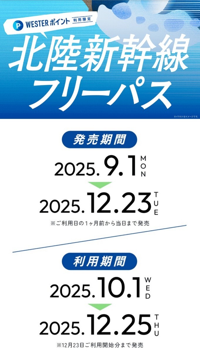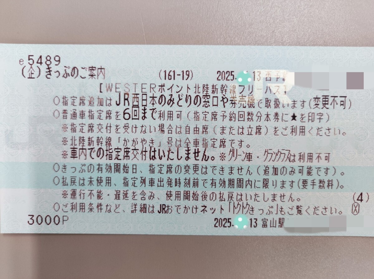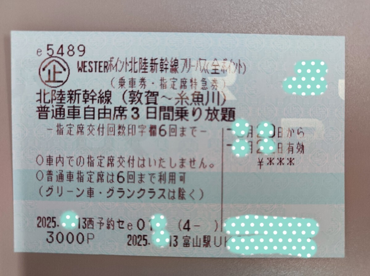 JR西日本『WESTERポイント北陸新幹線フリーパス(北陸新幹線:敦賀~糸魚川間)(全ポイント)』(未使用)になります。