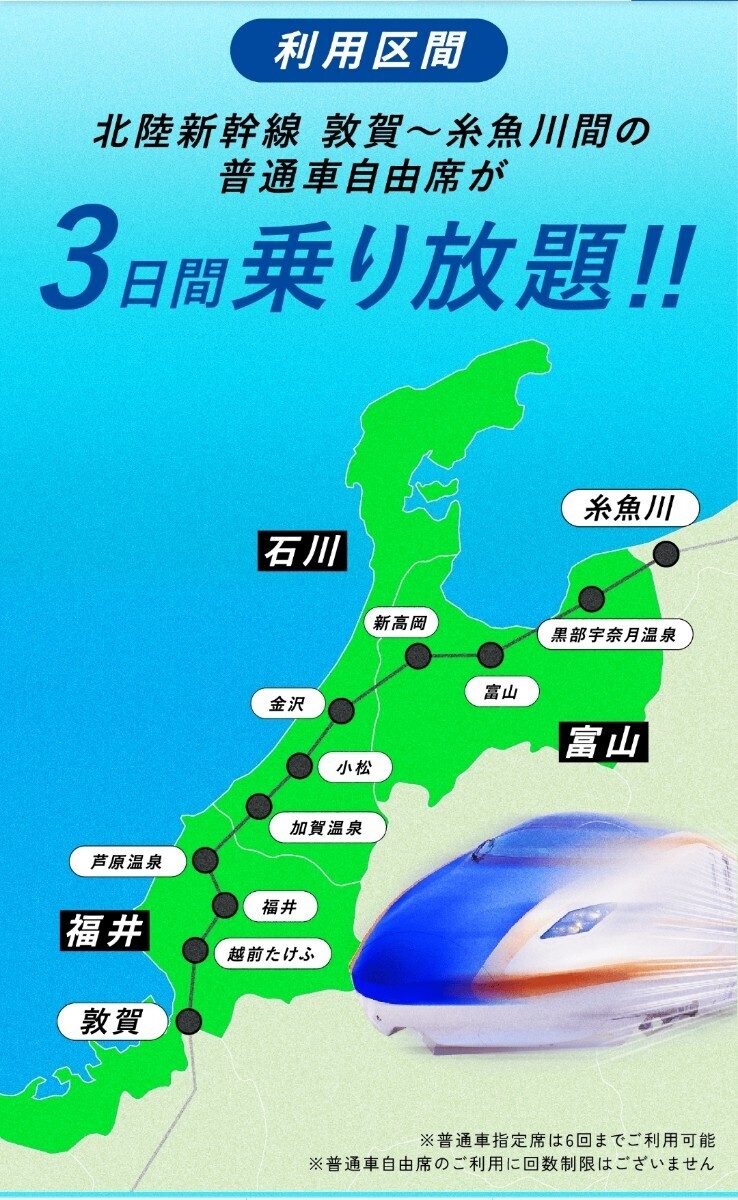 北陸新幹線の(敦賀~糸魚川 間)の 普通車 自由席を3日間乗り放題できるおトクなきっぷです。