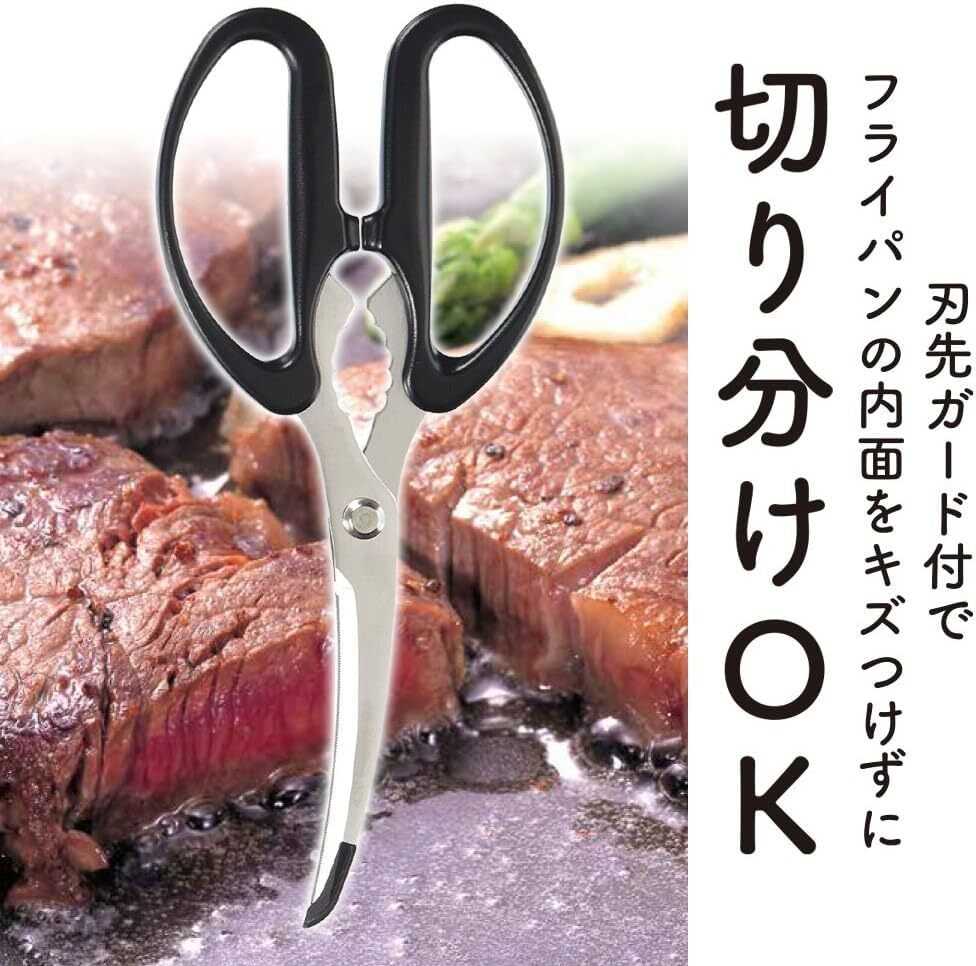 説明 フライパンの上でそのままステーキをカット! 刃先ガードが付いているから、フライパンを傷つけません。