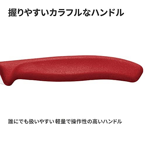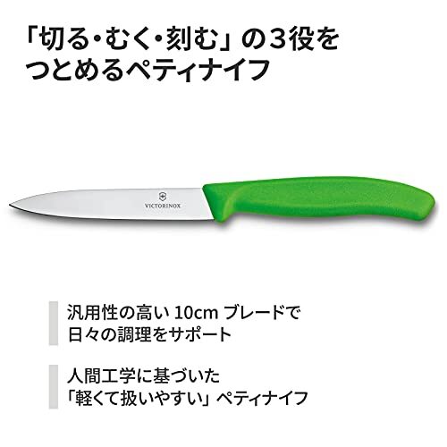 商品紹介 果物や野菜の皮むきや飾り切りなどに便利です。とても軽量なので、繊細な作業にも最適です。 より ●ビクトリノックスでは、世界的なナイフメーカーとして創業当初より、家庭やプロフェッショナル向けのキッチン・料理用ナイフ、食肉加工用のブッチャーナイフ、ケーキ作りには欠かせないスパチュラ等を作り続けています。その切れ味と使いやすさから、世界の一流レストランやパティシエのシェフなど、料理のプロたちに選ばれています ●“スイスクラシック”シリーズのキッチンナイフは、人間工学に基づきデザインされ、滑りにくく、握りやすいハンドルが特徴です ●独自仕様の高品質ステンレススチールを最適な硬度に熱処理し、刃付けの角度はレーザーテストを実施することで鋭い切れ味を実現しています ●生産は全て、スイスにある本社工場の厳しい品質管理の下で行われています ●ビタミンCが豊富な柑橘系フルーツをイメージした4色が新発売 ●グリーンは、ライムグリーンをイメージしています ●また、ナイフは食材に直接触れる機会が多いので衛生管理が重要です。お肉やお魚を切ったナイフで野菜のカットや果物の皮むきはちょっと抵抗ある。そんな時は、あらかじめ食材により使用するハンドルのカラーを決めておけば、食材の匂い移りやクロスコンタミネーションを極力減らすことができます ●野菜のカットや果物の皮むき、簡単な調理作業などに使用できます
