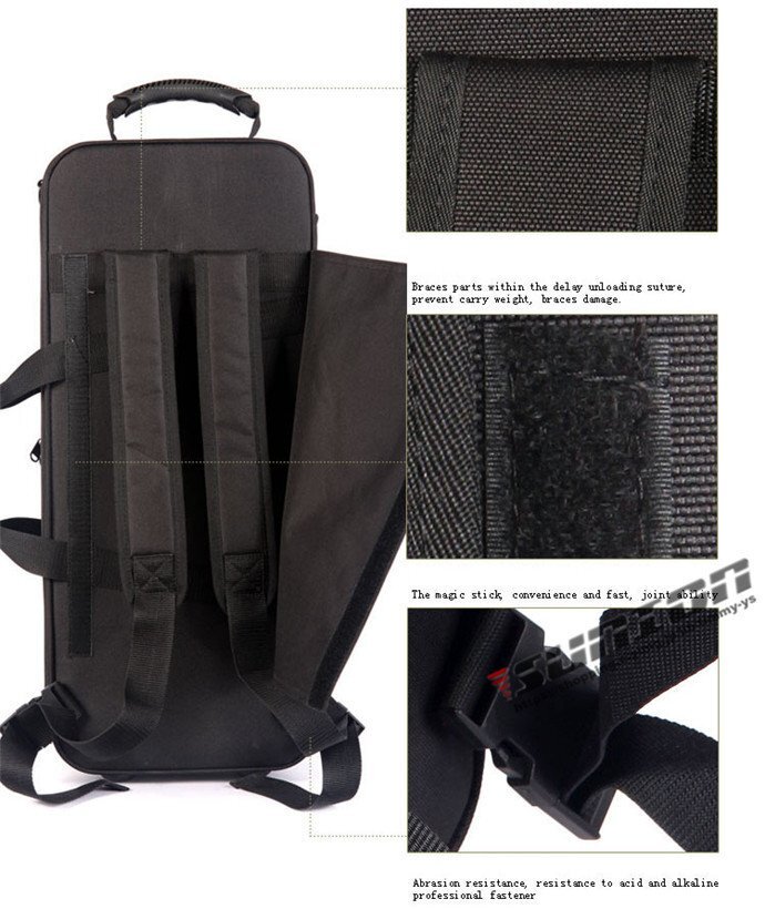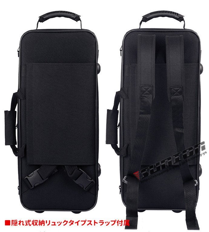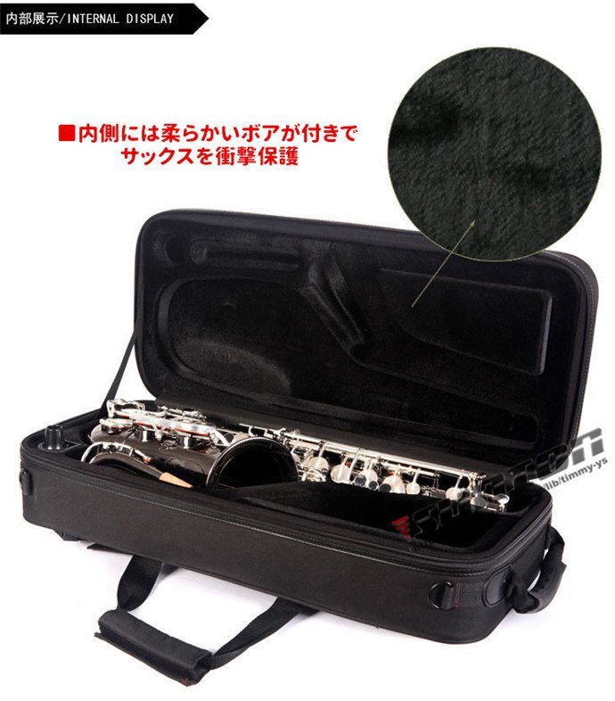 ALTO SAX CASE アルトサックス用ケース■管楽器 楽器ケース バッグ■アルト サクソフォーン用■カラー: ブラック■素 材:防撥水ナイロン中 部 約18mmフォームパッドを採用■外寸法: 63×27×15m■内寸法: 58×25m■バックポケット(A4サイズ対応)■外寸法: 42×21cm■重量: 約2.95Kg■ショルダー&リュックタイプストラップ付属■内側には柔らかいボアが付きでサックスを衝撃保護※画像はイメージです。サックス本体は付属しておりません。一般的なアルトサックスを参考にしている汎用のケースです。