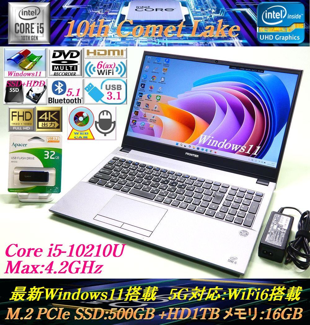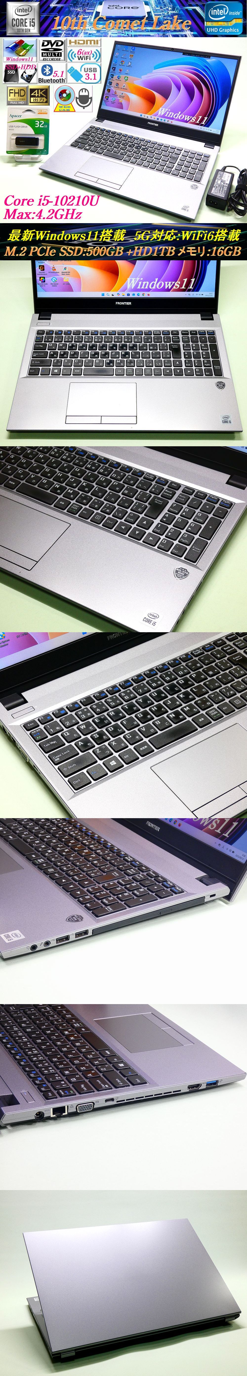 【特徴】:高性能、高速、最新多機能(内蔵3ドライブ仕様)パソコン -高年式2022年1月モデル →Windows11正式対応モデル -Windows11最新バージョン 25H2搭載 -インテル 第10世代CPU Core i5-10210U -インテル UHD グラフィックス for 10th Gen -大容量 SSD/500GB(M.2, NVME, PCIe) -大容量 HDD/1TB(SATA600) -DVDマルチドライブ -大容量 メモリ/16GB(DDR4-2666) -USB3.1 Type-C コネクタ -WiFi6(ax)対応&Bluetooth5.1 -オールセットアップ済。即使用OK!! →充実したマニュアルも標準添付 FRONTIERについて 国内製造のブランドで、高性能かつ高機能なパソコンの製作に定評があります。 基本性能の充実はもちろん、拡張性や音響、メンテナンス性など多角的な設計が高く評価されており、根強い人気を誇ります。 特に注目すべきは、拡張性を最大限に活かした「内蔵3ドライブ仕様」です。 これは高速なNVMe SSD、大容量のSATA バックアップ用途のHDD、そして光学ドライブを組み合わせた構成で、パフォーマンスとストレージ容量の両立に加えディスク記録も可能にしています。 第7世代と比較して、CPU性能は約1.8倍に向上。処理能力が飛躍的に進化し、動画編集やゲームも快適に楽しめます。 さらに、PCIe対応の超高速SSDを搭載。OSやアプリをSSDに配置することで、起動時間を大幅に短縮し、複数のアプリを同時に使う作業もスムーズにこなせます。 加えて、高速DDR4メモリ(デュアルチャネル対応)を採用し、データ処理のさらなる高速化を実現。日常使いからクリエイティブな作業まで、あらゆるシーンで快適なパフォーマンスを発揮します。