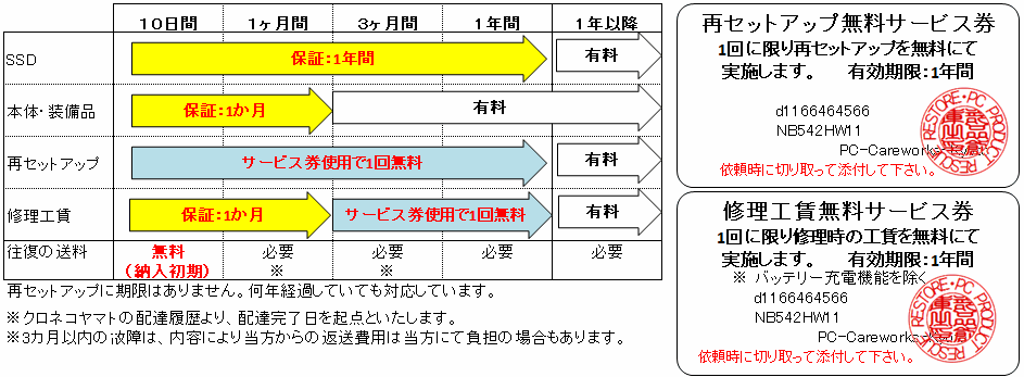 | 保証・アフターサービス | 到着後10日以内に動作確認お願いします。 PC本体に不具合が発生した場合は、取引ナビ、専用メールアドレスに連絡頂ければ 迅速に対応いたします。初期10日間につきましては、修理対応または返金にて対応となります。 アフターサービスにて『無料再セットアップ』『工賃無料』サービス券がご使用頂けます。 ※各1回の使用が可能。 可能な範囲で、メールによるアフター対応も実施しています。 ※専用メールアドレスにて対応となります。(アフターサービスのご案内に記載) |