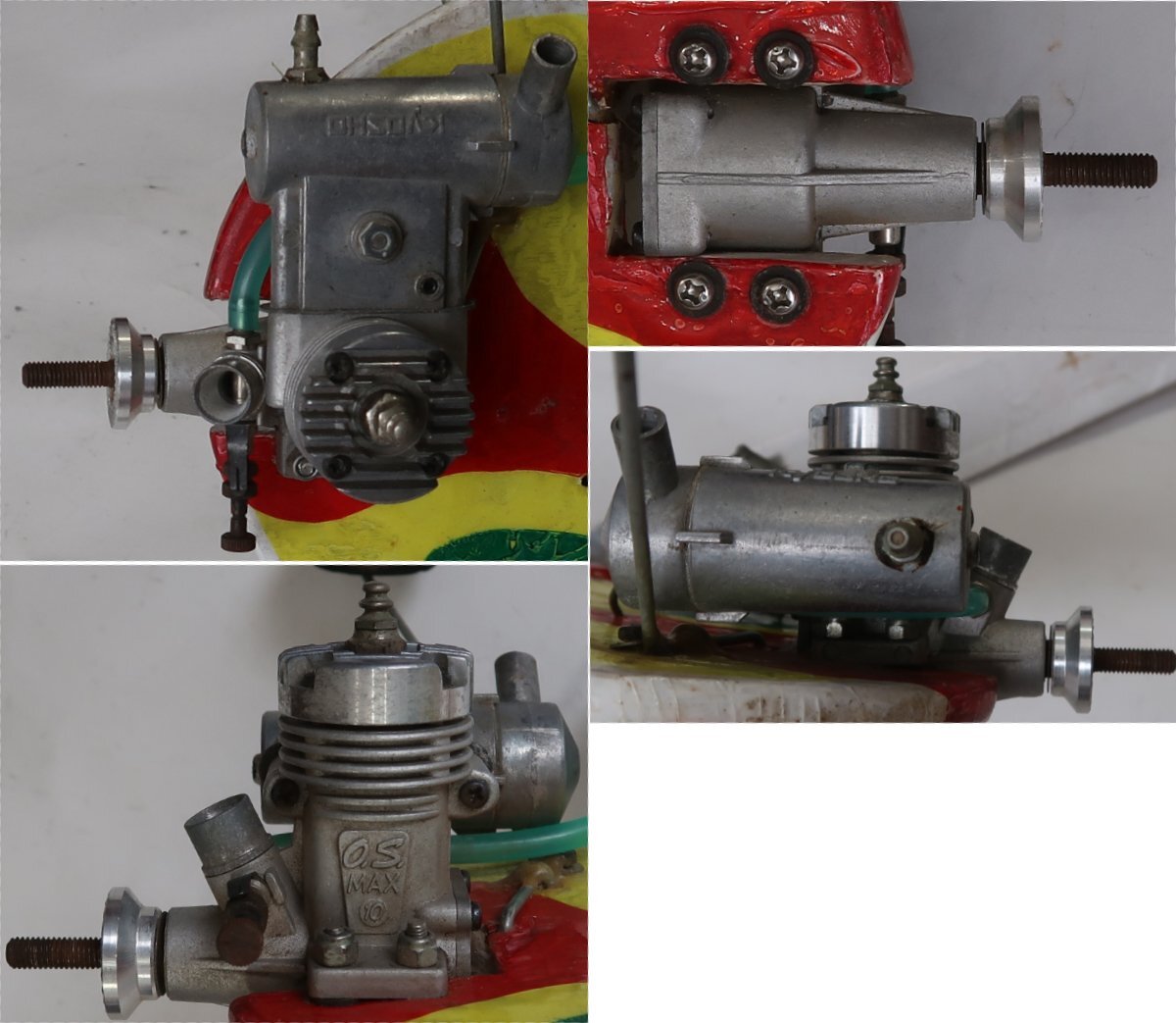 付属のエンジンはOS MAX 10です。出品は画像の物のみです。使用品ですので擦れや汚れはあります。軸を回すと回転するので、ピストンは固着していないようです。その他は一切の動作テストは出来ておりません。分かることは以上です。このような状態ですのでお取引後はいかなる理由がありましても返品はできませんし、クレームはお受けできません。