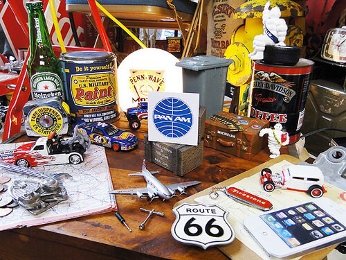 無地の小物やなんかにこのステッカーを貼ると、懐かしいアメリカがそこに戻ってきたって感じに変身するの!