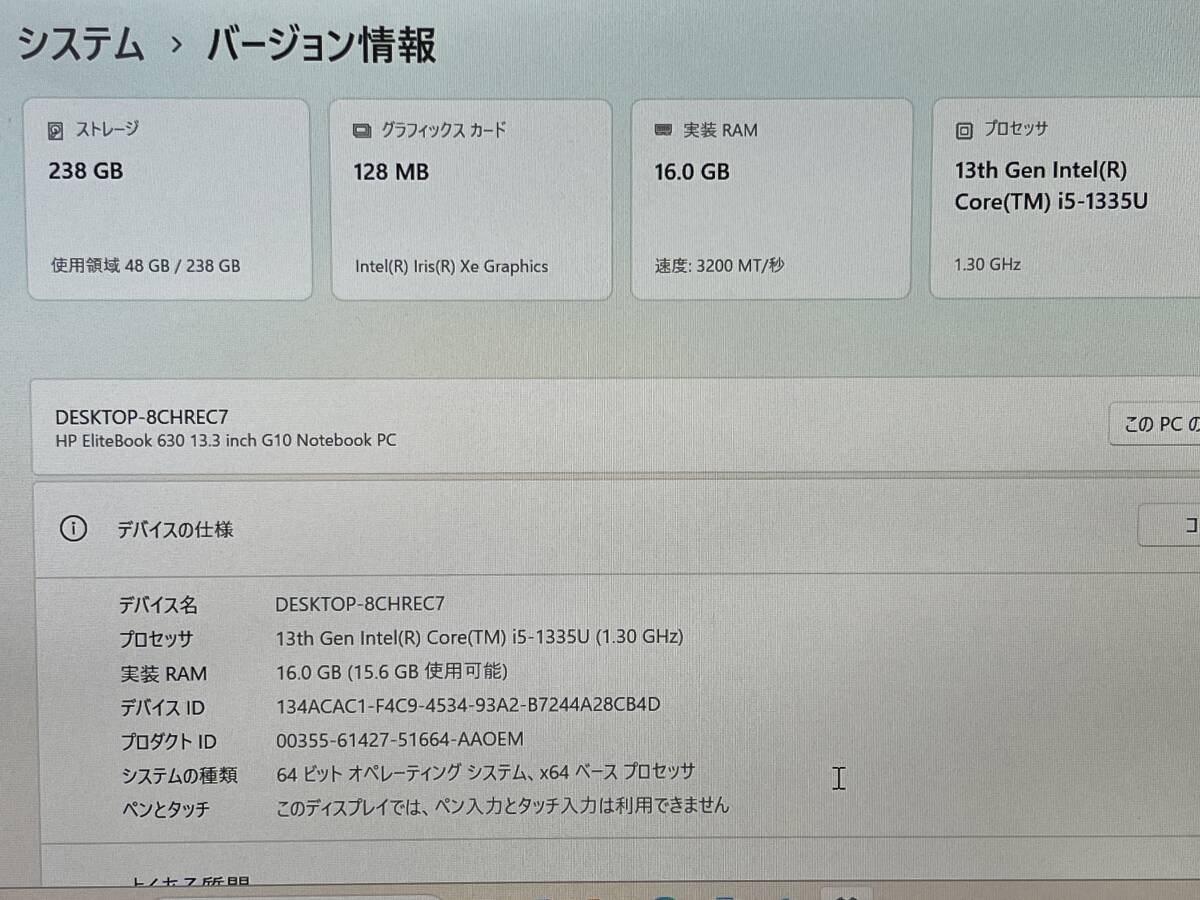 「ジャンク品」HP EliteBook 630 G10 / Core i5-1335U 1.30GHz / メモリ16GB / SSD 256GB / Windows 11Pro