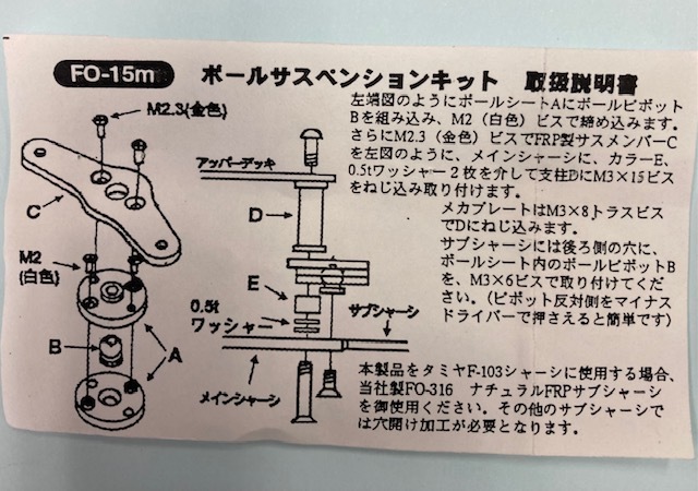 | ガタの無いスムーズなリヤ・サスロールを実現!! F102用にはそのままビルトイン。 F103シャーシに搭載の場合は当社製FO316とセットで組み込み可能です。 ●FO316,FO27,FO29,FO15mの搭載で異次元の走りを実体験下さい。 ※定価1,800円がオークション30%OFFの限定価格\1,400(税込み) F104パーツ適合表 |